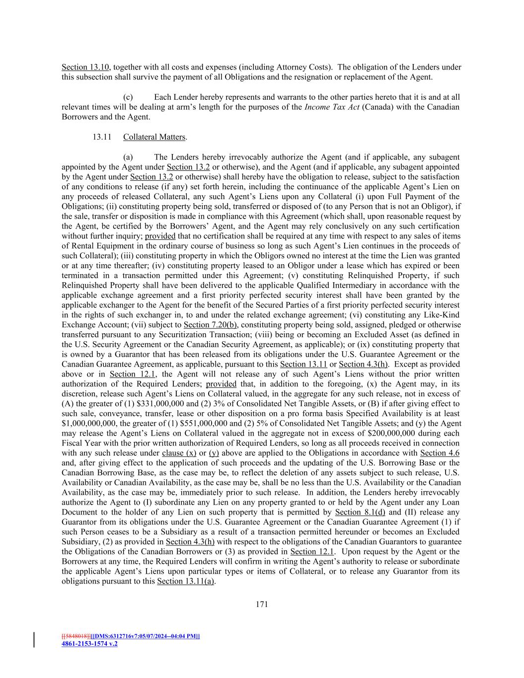 Section 13.10, together with all costs and expenses (including Attorney Costs). The obligation of the Lenders under this subsection shall survive the payment of all Obligations and the resignation or replacement of the Agent. (c) Each Lender hereby represents and warrants to the other parties hereto that it is and at all relevant times will be dealing at arm’s length for the purposes of the Income Tax Act (Canada) with the Canadian Borrowers and the Agent. 13.11 Collateral Matters. (a) The Lenders hereby irrevocably authorize the Agent (and if applicable, any subagent appointed by the Agent under Section 13.2 or otherwise), and the Agent (and if applicable, any subagent appointed by the Agent under Section 13.2 or otherwise) shall hereby have the obligation to release, subject to the satisfaction of any conditions to release (if any) set forth herein, including the continuance of the applicable Agent’s Lien on any proceeds of released Collateral, any such Agent’s Liens upon any Collateral (i) upon Full Payment of the Obligations; (ii) constituting property being sold, transferred or disposed of (to any Person that is not an Obligor), if the sale, transfer or disposition is made in compliance with this Agreement (which shall, upon reasonable request by the Agent, be certified by the Borrowers’ Agent, and the Agent may rely conclusively on any such certification without further inquiry; provided that no certification shall be required at any time with respect to any sales of items of Rental Equipment in the ordinary course of business so long as such Agent’s Lien continues in the proceeds of such Collateral); (iii) constituting property in which the Obligors owned no interest at the time the Lien was granted or at any time thereafter; (iv) constituting property leased to an Obligor under a lease which has expired or been terminated in a transaction permitted under this Agreement; (v) constituting Relinquished Property, if such Relinquished Property shall have been delivered to the applicable Qualified Intermediary in accordance with the applicable exchange agreement and a first priority perfected security interest shall have been granted by the applicable exchanger to the Agent for the benefit of the Secured Parties of a first priority perfected security interest in the rights of such exchanger in, to and under the related exchange agreement; (vi) constituting any Like-Kind Exchange Account; (vii) subject to Section 7.20(b), constituting property being sold, assigned, pledged or otherwise transferred pursuant to any Securitization Transaction; (viii) being or becoming an Excluded Asset (as defined in the U.S. Security Agreement or the Canadian Security Agreement, as applicable); or (ix) constituting property that is owned by a Guarantor that has been released from its obligations under the U.S. Guarantee Agreement or the Canadian Guarantee Agreement, as applicable, pursuant to this Section 13.11 or Section 4.3(h). Except as provided above or in Section 12.1, the Agent will not release any of such Agent’s Liens without the prior written authorization of the Required Lenders; provided that, in addition to the foregoing, (x) the Agent may, in its discretion, release such Agent’s Liens on Collateral valued, in the aggregate for any such release, not in excess of (A) the greater of (1) $331,000,000 and (2) 3% of Consolidated Net Tangible Assets, or (B) if after giving effect to such sale, conveyance, transfer, lease or other disposition on a pro forma basis Specified Availability is at least $1,000,000,000, the greater of (1) $551,000,000 and (2) 5% of Consolidated Net Tangible Assets; and (y) the Agent may release the Agent’s Liens on Collateral valued in the aggregate not in excess of $200,000,000 during each Fiscal Year with the prior written authorization of Required Lenders, so long as all proceeds received in connection with any such release under clause (x) or (y) above are applied to the Obligations in accordance with Section 4.6 and, after giving effect to the application of such proceeds and the updating of the U.S. Borrowing Base or the Canadian Borrowing Base, as the case may be, to reflect the deletion of any assets subject to such release, U.S. Availability or Canadian Availability, as the case may be, shall be no less than the U.S. Availability or the Canadian Availability, as the case may be, immediately prior to such release. In addition, the Lenders hereby irrevocably authorize the Agent to (I) subordinate any Lien on any property granted to or held by the Agent under any Loan Document to the holder of any Lien on such property that is permitted by Section 8.1(d) and (II) release any Guarantor from its obligations under the U.S. Guarantee Agreement or the Canadian Guarantee Agreement (1) if such Person ceases to be a Subsidiary as a result of a transaction permitted hereunder or becomes an Excluded Subsidiary, (2) as provided in Section 4.3(h) with respect to the obligations of the Canadian Guarantors to guarantee the Obligations of the Canadian Borrowers or (3) as provided in Section 12.1. Upon request by the Agent or the Borrowers at any time, the Required Lenders will confirm in writing the Agent’s authority to release or subordinate the applicable Agent’s Liens upon particular types or items of Collateral, or to release any Guarantor from its obligations pursuant to this Section 13.11(a). 171 [[5848018]][[DMS:6312716v7:05/07/2024--04:04 PM]] 4861-2153-1574 v.2