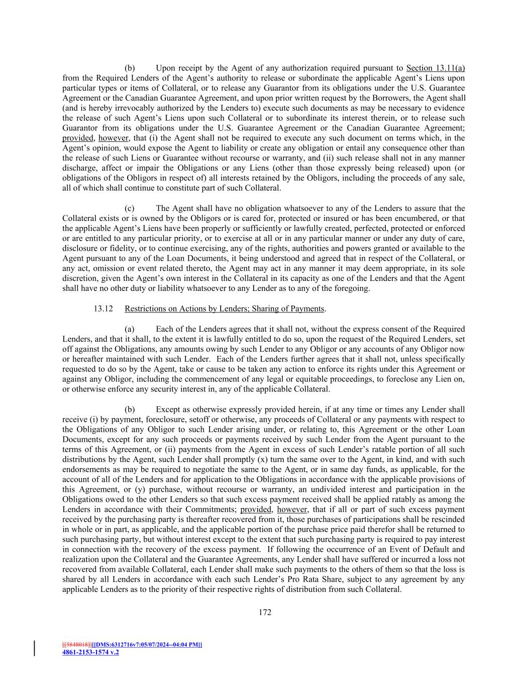 (b) Upon receipt by the Agent of any authorization required pursuant to Section 13.11(a) from the Required Lenders of the Agent’s authority to release or subordinate the applicable Agent’s Liens upon particular types or items of Collateral, or to release any Guarantor from its obligations under the U.S. Guarantee Agreement or the Canadian Guarantee Agreement, and upon prior written request by the Borrowers, the Agent shall (and is hereby irrevocably authorized by the Lenders to) execute such documents as may be necessary to evidence the release of such Agent’s Liens upon such Collateral or to subordinate its interest therein, or to release such Guarantor from its obligations under the U.S. Guarantee Agreement or the Canadian Guarantee Agreement; provided, however, that (i) the Agent shall not be required to execute any such document on terms which, in the Agent’s opinion, would expose the Agent to liability or create any obligation or entail any consequence other than the release of such Liens or Guarantee without recourse or warranty, and (ii) such release shall not in any manner discharge, affect or impair the Obligations or any Liens (other than those expressly being released) upon (or obligations of the Obligors in respect of) all interests retained by the Obligors, including the proceeds of any sale, all of which shall continue to constitute part of such Collateral. (c) The Agent shall have no obligation whatsoever to any of the Lenders to assure that the Collateral exists or is owned by the Obligors or is cared for, protected or insured or has been encumbered, or that the applicable Agent’s Liens have been properly or sufficiently or lawfully created, perfected, protected or enforced or are entitled to any particular priority, or to exercise at all or in any particular manner or under any duty of care, disclosure or fidelity, or to continue exercising, any of the rights, authorities and powers granted or available to the Agent pursuant to any of the Loan Documents, it being understood and agreed that in respect of the Collateral, or any act, omission or event related thereto, the Agent may act in any manner it may deem appropriate, in its sole discretion, given the Agent’s own interest in the Collateral in its capacity as one of the Lenders and that the Agent shall have no other duty or liability whatsoever to any Lender as to any of the foregoing. 13.12 Restrictions on Actions by Lenders; Sharing of Payments. (a) Each of the Lenders agrees that it shall not, without the express consent of the Required Lenders, and that it shall, to the extent it is lawfully entitled to do so, upon the request of the Required Lenders, set off against the Obligations, any amounts owing by such Lender to any Obligor or any accounts of any Obligor now or hereafter maintained with such Lender. Each of the Lenders further agrees that it shall not, unless specifically requested to do so by the Agent, take or cause to be taken any action to enforce its rights under this Agreement or against any Obligor, including the commencement of any legal or equitable proceedings, to foreclose any Lien on, or otherwise enforce any security interest in, any of the applicable Collateral. (b) Except as otherwise expressly provided herein, if at any time or times any Lender shall receive (i) by payment, foreclosure, setoff or otherwise, any proceeds of Collateral or any payments with respect to the Obligations of any Obligor to such Lender arising under, or relating to, this Agreement or the other Loan Documents, except for any such proceeds or payments received by such Lender from the Agent pursuant to the terms of this Agreement, or (ii) payments from the Agent in excess of such Lender’s ratable portion of all such distributions by the Agent, such Lender shall promptly (x) turn the same over to the Agent, in kind, and with such endorsements as may be required to negotiate the same to the Agent, or in same day funds, as applicable, for the account of all of the Lenders and for application to the Obligations in accordance with the applicable provisions of this Agreement, or (y) purchase, without recourse or warranty, an undivided interest and participation in the Obligations owed to the other Lenders so that such excess payment received shall be applied ratably as among the Lenders in accordance with their Commitments; provided, however, that if all or part of such excess payment received by the purchasing party is thereafter recovered from it, those purchases of participations shall be rescinded in whole or in part, as applicable, and the applicable portion of the purchase price paid therefor shall be returned to such purchasing party, but without interest except to the extent that such purchasing party is required to pay interest in connection with the recovery of the excess payment. If following the occurrence of an Event of Default and realization upon the Collateral and the Guarantee Agreements, any Lender shall have suffered or incurred a loss not recovered from available Collateral, each Lender shall make such payments to the others of them so that the loss is shared by all Lenders in accordance with each such Lender’s Pro Rata Share, subject to any agreement by any applicable Lenders as to the priority of their respective rights of distribution from such Collateral. 172 [[5848018]][[DMS:6312716v7:05/07/2024--04:04 PM]] 4861-2153-1574 v.2