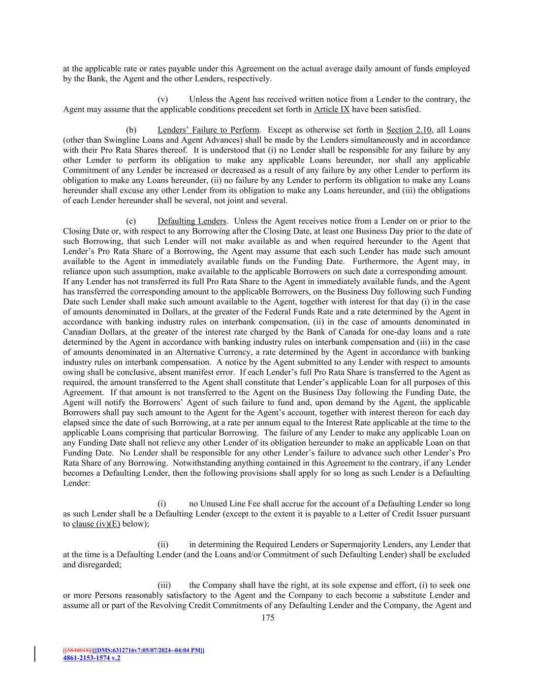 at the applicable rate or rates payable under this Agreement on the actual average daily amount of funds employed by the Bank, the Agent and the other Lenders, respectively. (v) Unless the Agent has received written notice from a Lender to the contrary, the Agent may assume that the applicable conditions precedent set forth in Article IX have been satisfied. (b) Lenders’ Failure to Perform. Except as otherwise set forth in Section 2.10, all Loans (other than Swingline Loans and Agent Advances) shall be made by the Lenders simultaneously and in accordance with their Pro Rata Shares thereof. It is understood that (i) no Lender shall be responsible for any failure by any other Lender to perform its obligation to make any applicable Loans hereunder, nor shall any applicable Commitment of any Lender be increased or decreased as a result of any failure by any other Lender to perform its obligation to make any Loans hereunder, (ii) no failure by any Lender to perform its obligation to make any Loans hereunder shall excuse any other Lender from its obligation to make any Loans hereunder, and (iii) the obligations of each Lender hereunder shall be several, not joint and several. (c) Defaulting Lenders. Unless the Agent receives notice from a Lender on or prior to the Closing Date or, with respect to any Borrowing after the Closing Date, at least one Business Day prior to the date of such Borrowing, that such Lender will not make available as and when required hereunder to the Agent that Lender’s Pro Rata Share of a Borrowing, the Agent may assume that each such Lender has made such amount available to the Agent in immediately available funds on the Funding Date. Furthermore, the Agent may, in reliance upon such assumption, make available to the applicable Borrowers on such date a corresponding amount. If any Lender has not transferred its full Pro Rata Share to the Agent in immediately available funds, and the Agent has transferred the corresponding amount to the applicable Borrowers, on the Business Day following such Funding Date such Lender shall make such amount available to the Agent, together with interest for that day (i) in the case of amounts denominated in Dollars, at the greater of the Federal Funds Rate and a rate determined by the Agent in accordance with banking industry rules on interbank compensation, (ii) in the case of amounts denominated in Canadian Dollars, at the greater of the interest rate charged by the Bank of Canada for one-day loans and a rate determined by the Agent in accordance with banking industry rules on interbank compensation and (iii) in the case of amounts denominated in an Alternative Currency, a rate determined by the Agent in accordance with banking industry rules on interbank compensation. A notice by the Agent submitted to any Lender with respect to amounts owing shall be conclusive, absent manifest error. If each Lender’s full Pro Rata Share is transferred to the Agent as required, the amount transferred to the Agent shall constitute that Lender’s applicable Loan for all purposes of this Agreement. If that amount is not transferred to the Agent on the Business Day following the Funding Date, the Agent will notify the Borrowers’ Agent of such failure to fund and, upon demand by the Agent, the applicable Borrowers shall pay such amount to the Agent for the Agent’s account, together with interest thereon for each day elapsed since the date of such Borrowing, at a rate per annum equal to the Interest Rate applicable at the time to the applicable Loans comprising that particular Borrowing. The failure of any Lender to make any applicable Loan on any Funding Date shall not relieve any other Lender of its obligation hereunder to make an applicable Loan on that Funding Date. No Lender shall be responsible for any other Lender’s failure to advance such other Lender’s Pro Rata Share of any Borrowing. Notwithstanding anything contained in this Agreement to the contrary, if any Lender becomes a Defaulting Lender, then the following provisions shall apply for so long as such Lender is a Defaulting Lender: (i) no Unused Line Fee shall accrue for the account of a Defaulting Lender so long as such Lender shall be a Defaulting Lender (except to the extent it is payable to a Letter of Credit Issuer pursuant to clause (iv)(E) below); (ii) in determining the Required Lenders or Supermajority Lenders, any Lender that at the time is a Defaulting Lender (and the Loans and/or Commitment of such Defaulting Lender) shall be excluded and disregarded; (iii) the Company shall have the right, at its sole expense and effort, (i) to seek one or more Persons reasonably satisfactory to the Agent and the Company to each become a substitute Lender and assume all or part of the Revolving Credit Commitments of any Defaulting Lender and the Company, the Agent and 175 [[5848018]][[DMS:6312716v7:05/07/2024--04:04 PM]] 4861-2153-1574 v.2