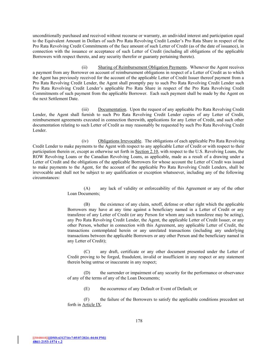 unconditionally purchased and received without recourse or warranty, an undivided interest and participation equal to the Equivalent Amount in Dollars of such Pro Rata Revolving Credit Lender’s Pro Rata Share in respect of the Pro Rata Revolving Credit Commitments of the face amount of such Letter of Credit (as of the date of issuance), in connection with the issuance or acceptance of such Letter of Credit (including all obligations of the applicable Borrowers with respect thereto, and any security therefor or guaranty pertaining thereto). (ii) Sharing of Reimbursement Obligation Payments. Whenever the Agent receives a payment from any Borrower on account of reimbursement obligations in respect of a Letter of Credit as to which the Agent has previously received for the account of the applicable Letter of Credit Issuer thereof payment from a Pro Rata Revolving Credit Lender, the Agent shall promptly pay to such Pro Rata Revolving Credit Lender such Pro Rata Revolving Credit Lender’s applicable Pro Rata Share in respect of the Pro Rata Revolving Credit Commitments of such payment from the applicable Borrower. Each such payment shall be made by the Agent on the next Settlement Date. (iii) Documentation. Upon the request of any applicable Pro Rata Revolving Credit Lender, the Agent shall furnish to such Pro Rata Revolving Credit Lender copies of any Letter of Credit, reimbursement agreements executed in connection therewith, applications for any Letter of Credit, and such other documentation relating to such Letter of Credit as may reasonably be requested by such Pro Rata Revolving Credit Lender. (iv) Obligations Irrevocable. The obligations of each applicable Pro Rata Revolving Credit Lender to make payments to the Agent with respect to any applicable Letter of Credit or with respect to their participation therein or, except as otherwise set forth in Section 2.10, with respect to the U.S. Revolving Loans, the ROW Revolving Loans or the Canadian Revolving Loans, as applicable, made as a result of a drawing under a Letter of Credit and the obligations of the applicable Borrowers for whose account the Letter of Credit was issued to make payments to the Agent, for the account of the applicable Pro Rata Revolving Credit Lenders, shall be irrevocable and shall not be subject to any qualification or exception whatsoever, including any of the following circumstances: (A) any lack of validity or enforceability of this Agreement or any of the other Loan Documents; (B) the existence of any claim, setoff, defense or other right which the applicable Borrowers may have at any time against a beneficiary named in a Letter of Credit or any transferee of any Letter of Credit (or any Person for whom any such transferee may be acting), any Pro Rata Revolving Credit Lender, the Agent, the applicable Letter of Credit Issuer, or any other Person, whether in connection with this Agreement, any applicable Letter of Credit, the transactions contemplated herein or any unrelated transactions (including any underlying transactions between the applicable Borrowers or any other Person and the beneficiary named in any Letter of Credit); (C) any draft, certificate or any other document presented under the Letter of Credit proving to be forged, fraudulent, invalid or insufficient in any respect or any statement therein being untrue or inaccurate in any respect; (D) the surrender or impairment of any security for the performance or observance of any of the terms of any of the Loan Documents; (E) the occurrence of any Default or Event of Default; or (F) the failure of the Borrowers to satisfy the applicable conditions precedent set forth in Article IX. 178 [[5848018]][[DMS:6312716v7:05/07/2024--04:04 PM]] 4861-2153-1574 v.2