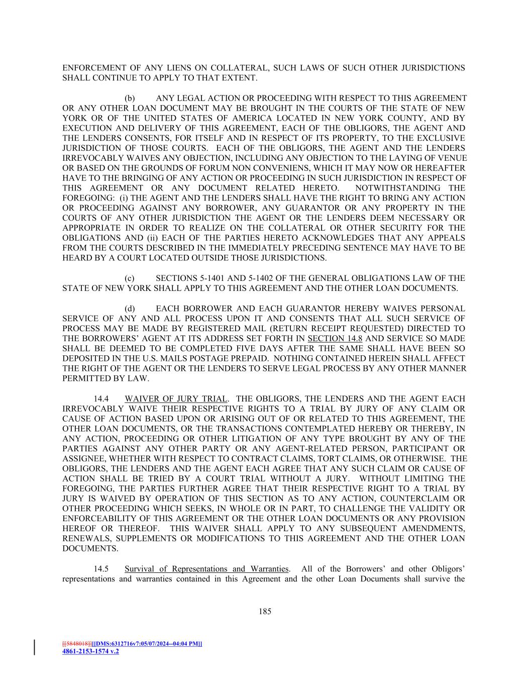ENFORCEMENT OF ANY LIENS ON COLLATERAL, SUCH LAWS OF SUCH OTHER JURISDICTIONS SHALL CONTINUE TO APPLY TO THAT EXTENT. (b) ANY LEGAL ACTION OR PROCEEDING WITH RESPECT TO THIS AGREEMENT OR ANY OTHER LOAN DOCUMENT MAY BE BROUGHT IN THE COURTS OF THE STATE OF NEW YORK OR OF THE UNITED STATES OF AMERICA LOCATED IN NEW YORK COUNTY, AND BY EXECUTION AND DELIVERY OF THIS AGREEMENT, EACH OF THE OBLIGORS, THE AGENT AND THE LENDERS CONSENTS, FOR ITSELF AND IN RESPECT OF ITS PROPERTY, TO THE EXCLUSIVE JURISDICTION OF THOSE COURTS. EACH OF THE OBLIGORS, THE AGENT AND THE LENDERS IRREVOCABLY WAIVES ANY OBJECTION, INCLUDING ANY OBJECTION TO THE LAYING OF VENUE OR BASED ON THE GROUNDS OF FORUM NON CONVENIENS, WHICH IT MAY NOW OR HEREAFTER HAVE TO THE BRINGING OF ANY ACTION OR PROCEEDING IN SUCH JURISDICTION IN RESPECT OF THIS AGREEMENT OR ANY DOCUMENT RELATED HERETO. NOTWITHSTANDING THE FOREGOING: (i) THE AGENT AND THE LENDERS SHALL HAVE THE RIGHT TO BRING ANY ACTION OR PROCEEDING AGAINST ANY BORROWER, ANY GUARANTOR OR ANY PROPERTY IN THE COURTS OF ANY OTHER JURISDICTION THE AGENT OR THE LENDERS DEEM NECESSARY OR APPROPRIATE IN ORDER TO REALIZE ON THE COLLATERAL OR OTHER SECURITY FOR THE OBLIGATIONS AND (ii) EACH OF THE PARTIES HERETO ACKNOWLEDGES THAT ANY APPEALS FROM THE COURTS DESCRIBED IN THE IMMEDIATELY PRECEDING SENTENCE MAY HAVE TO BE HEARD BY A COURT LOCATED OUTSIDE THOSE JURISDICTIONS. (c) SECTIONS 5-1401 AND 5-1402 OF THE GENERAL OBLIGATIONS LAW OF THE STATE OF NEW YORK SHALL APPLY TO THIS AGREEMENT AND THE OTHER LOAN DOCUMENTS. (d) EACH BORROWER AND EACH GUARANTOR HEREBY WAIVES PERSONAL SERVICE OF ANY AND ALL PROCESS UPON IT AND CONSENTS THAT ALL SUCH SERVICE OF PROCESS MAY BE MADE BY REGISTERED MAIL (RETURN RECEIPT REQUESTED) DIRECTED TO THE BORROWERS’ AGENT AT ITS ADDRESS SET FORTH IN SECTION 14.8 AND SERVICE SO MADE SHALL BE DEEMED TO BE COMPLETED FIVE DAYS AFTER THE SAME SHALL HAVE BEEN SO DEPOSITED IN THE U.S. MAILS POSTAGE PREPAID. NOTHING CONTAINED HEREIN SHALL AFFECT THE RIGHT OF THE AGENT OR THE LENDERS TO SERVE LEGAL PROCESS BY ANY OTHER MANNER PERMITTED BY LAW. 14.4 WAIVER OF JURY TRIAL. THE OBLIGORS, THE LENDERS AND THE AGENT EACH IRREVOCABLY WAIVE THEIR RESPECTIVE RIGHTS TO A TRIAL BY JURY OF ANY CLAIM OR CAUSE OF ACTION BASED UPON OR ARISING OUT OF OR RELATED TO THIS AGREEMENT, THE OTHER LOAN DOCUMENTS, OR THE TRANSACTIONS CONTEMPLATED HEREBY OR THEREBY, IN ANY ACTION, PROCEEDING OR OTHER LITIGATION OF ANY TYPE BROUGHT BY ANY OF THE PARTIES AGAINST ANY OTHER PARTY OR ANY AGENT-RELATED PERSON, PARTICIPANT OR ASSIGNEE, WHETHER WITH RESPECT TO CONTRACT CLAIMS, TORT CLAIMS, OR OTHERWISE. THE OBLIGORS, THE LENDERS AND THE AGENT EACH AGREE THAT ANY SUCH CLAIM OR CAUSE OF ACTION SHALL BE TRIED BY A COURT TRIAL WITHOUT A JURY. WITHOUT LIMITING THE FOREGOING, THE PARTIES FURTHER AGREE THAT THEIR RESPECTIVE RIGHT TO A TRIAL BY JURY IS WAIVED BY OPERATION OF THIS SECTION AS TO ANY ACTION, COUNTERCLAIM OR OTHER PROCEEDING WHICH SEEKS, IN WHOLE OR IN PART, TO CHALLENGE THE VALIDITY OR ENFORCEABILITY OF THIS AGREEMENT OR THE OTHER LOAN DOCUMENTS OR ANY PROVISION HEREOF OR THEREOF. THIS WAIVER SHALL APPLY TO ANY SUBSEQUENT AMENDMENTS, RENEWALS, SUPPLEMENTS OR MODIFICATIONS TO THIS AGREEMENT AND THE OTHER LOAN DOCUMENTS. 14.5 Survival of Representations and Warranties. All of the Borrowers’ and other Obligors’ representations and warranties contained in this Agreement and the other Loan Documents shall survive the 185 [[5848018]][[DMS:6312716v7:05/07/2024--04:04 PM]] 4861-2153-1574 v.2