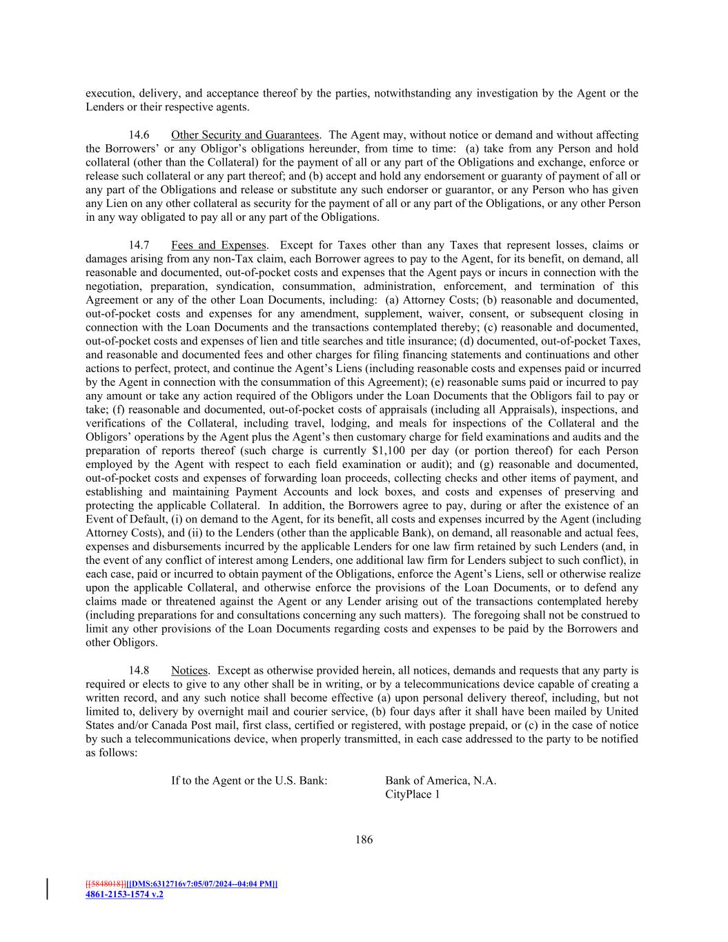 execution, delivery, and acceptance thereof by the parties, notwithstanding any investigation by the Agent or the Lenders or their respective agents. 14.6 Other Security and Guarantees. The Agent may, without notice or demand and without affecting the Borrowers’ or any Obligor’s obligations hereunder, from time to time: (a) take from any Person and hold collateral (other than the Collateral) for the payment of all or any part of the Obligations and exchange, enforce or release such collateral or any part thereof; and (b) accept and hold any endorsement or guaranty of payment of all or any part of the Obligations and release or substitute any such endorser or guarantor, or any Person who has given any Lien on any other collateral as security for the payment of all or any part of the Obligations, or any other Person in any way obligated to pay all or any part of the Obligations. 14.7 Fees and Expenses. Except for Taxes other than any Taxes that represent losses, claims or damages arising from any non-Tax claim, each Borrower agrees to pay to the Agent, for its benefit, on demand, all reasonable and documented, out-of-pocket costs and expenses that the Agent pays or incurs in connection with the negotiation, preparation, syndication, consummation, administration, enforcement, and termination of this Agreement or any of the other Loan Documents, including: (a) Attorney Costs; (b) reasonable and documented, out-of-pocket costs and expenses for any amendment, supplement, waiver, consent, or subsequent closing in connection with the Loan Documents and the transactions contemplated thereby; (c) reasonable and documented, out-of-pocket costs and expenses of lien and title searches and title insurance; (d) documented, out-of-pocket Taxes, and reasonable and documented fees and other charges for filing financing statements and continuations and other actions to perfect, protect, and continue the Agent’s Liens (including reasonable costs and expenses paid or incurred by the Agent in connection with the consummation of this Agreement); (e) reasonable sums paid or incurred to pay any amount or take any action required of the Obligors under the Loan Documents that the Obligors fail to pay or take; (f) reasonable and documented, out-of-pocket costs of appraisals (including all Appraisals), inspections, and verifications of the Collateral, including travel, lodging, and meals for inspections of the Collateral and the Obligors’ operations by the Agent plus the Agent’s then customary charge for field examinations and audits and the preparation of reports thereof (such charge is currently $1,100 per day (or portion thereof) for each Person employed by the Agent with respect to each field examination or audit); and (g) reasonable and documented, out-of-pocket costs and expenses of forwarding loan proceeds, collecting checks and other items of payment, and establishing and maintaining Payment Accounts and lock boxes, and costs and expenses of preserving and protecting the applicable Collateral. In addition, the Borrowers agree to pay, during or after the existence of an Event of Default, (i) on demand to the Agent, for its benefit, all costs and expenses incurred by the Agent (including Attorney Costs), and (ii) to the Lenders (other than the applicable Bank), on demand, all reasonable and actual fees, expenses and disbursements incurred by the applicable Lenders for one law firm retained by such Lenders (and, in the event of any conflict of interest among Lenders, one additional law firm for Lenders subject to such conflict), in each case, paid or incurred to obtain payment of the Obligations, enforce the Agent’s Liens, sell or otherwise realize upon the applicable Collateral, and otherwise enforce the provisions of the Loan Documents, or to defend any claims made or threatened against the Agent or any Lender arising out of the transactions contemplated hereby (including preparations for and consultations concerning any such matters). The foregoing shall not be construed to limit any other provisions of the Loan Documents regarding costs and expenses to be paid by the Borrowers and other Obligors. 14.8 Notices. Except as otherwise provided herein, all notices, demands and requests that any party is required or elects to give to any other shall be in writing, or by a telecommunications device capable of creating a written record, and any such notice shall become effective (a) upon personal delivery thereof, including, but not limited to, delivery by overnight mail and courier service, (b) four days after it shall have been mailed by United States and/or Canada Post mail, first class, certified or registered, with postage prepaid, or (c) in the case of notice by such a telecommunications device, when properly transmitted, in each case addressed to the party to be notified as follows: If to the Agent or the U.S. Bank: Bank of America, N.A. CityPlace 1 186 [[5848018]][[DMS:6312716v7:05/07/2024--04:04 PM]] 4861-2153-1574 v.2