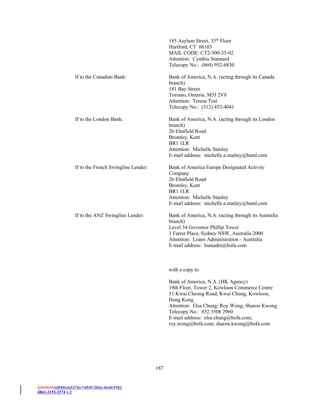 185 Asylum Street, 35th Floor Hartford, CT 06103 MAIL CODE: CT2-500-35-02 Attention: Cynthia Stannard Telecopy No.: (860) 952-6830 If to the Canadian Bank: Bank of America, N.A. (acting through its Canada branch) 181 Bay Street Toronto, Ontario, M5J 2V8 Attention: Teresa Tsui Telecopy No.: (312) 453-4041 If to the London Bank: Bank of America, N.A. (acting through its London branch) 26 Elmfield Road Bromley, Kent BR1 1LR Attention: Michelle Stanley E-mail address: michelle.a.stanley@baml.com If to the French Swingline Lender: Bank of America Europe Designated Activity Company 26 Elmfield Road Bromley, Kent BR1 1LR Attention: Michelle Stanley E-mail address: michelle.a.stanley@baml.com If to the ANZ Swingline Lender: Bank of America, N.A. (acting through its Australia branch) Level 34 Governor Phillip Tower 1 Farrer Place, Sydney NSW, Australia 2000 Attention: Loans Administration - Australia E-mail address: loanadm@bofa.com with a copy to Bank of America, N.A. (HK Agency) 19th Floor, Tower 2, Kowloon Commerce Centre 51 Kwai Cheong Road, Kwai Chung, Kowloon, Hong Kong Attention: Elsa Chung; Roy Wong; Sharon Kwong Telecopy No.: 852 3508 2960 E-mail address: elsa.chung@bofa.com; roy.wong@bofa.com; sharon.kwong@bofa.com 187 [[5848018]][[DMS:6312716v7:05/07/2024--04:04 PM]] 4861-2153-1574 v.2
