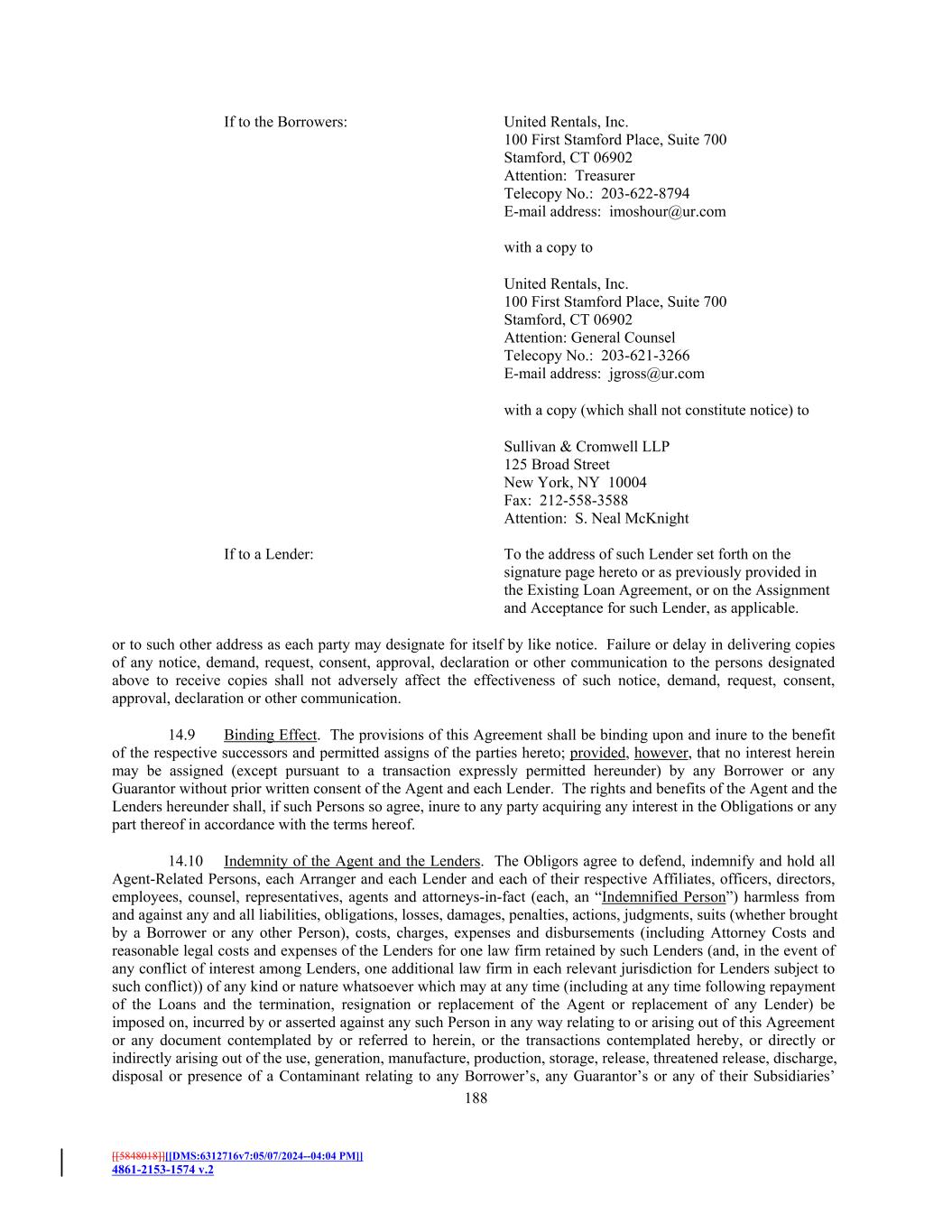 If to the Borrowers: United Rentals, Inc. 100 First Stamford Place, Suite 700 Stamford, CT 06902 Attention: Treasurer Telecopy No.: 203-622-8794 E-mail address: imoshour@ur.com with a copy to United Rentals, Inc. 100 First Stamford Place, Suite 700 Stamford, CT 06902 Attention: General Counsel Telecopy No.: 203-621-3266 E-mail address: jgross@ur.com with a copy (which shall not constitute notice) to Sullivan & Cromwell LLP 125 Broad Street New York, NY 10004 Fax: 212-558-3588 Attention: S. Neal McKnight If to a Lender: To the address of such Lender set forth on the signature page hereto or as previously provided in the Existing Loan Agreement, or on the Assignment and Acceptance for such Lender, as applicable. or to such other address as each party may designate for itself by like notice. Failure or delay in delivering copies of any notice, demand, request, consent, approval, declaration or other communication to the persons designated above to receive copies shall not adversely affect the effectiveness of such notice, demand, request, consent, approval, declaration or other communication. 14.9 Binding Effect. The provisions of this Agreement shall be binding upon and inure to the benefit of the respective successors and permitted assigns of the parties hereto; provided, however, that no interest herein may be assigned (except pursuant to a transaction expressly permitted hereunder) by any Borrower or any Guarantor without prior written consent of the Agent and each Lender. The rights and benefits of the Agent and the Lenders hereunder shall, if such Persons so agree, inure to any party acquiring any interest in the Obligations or any part thereof in accordance with the terms hereof. 14.10 Indemnity of the Agent and the Lenders. The Obligors agree to defend, indemnify and hold all Agent-Related Persons, each Arranger and each Lender and each of their respective Affiliates, officers, directors, employees, counsel, representatives, agents and attorneys-in-fact (each, an “Indemnified Person”) harmless from and against any and all liabilities, obligations, losses, damages, penalties, actions, judgments, suits (whether brought by a Borrower or any other Person), costs, charges, expenses and disbursements (including Attorney Costs and reasonable legal costs and expenses of the Lenders for one law firm retained by such Lenders (and, in the event of any conflict of interest among Lenders, one additional law firm in each relevant jurisdiction for Lenders subject to such conflict)) of any kind or nature whatsoever which may at any time (including at any time following repayment of the Loans and the termination, resignation or replacement of the Agent or replacement of any Lender) be imposed on, incurred by or asserted against any such Person in any way relating to or arising out of this Agreement or any document contemplated by or referred to herein, or the transactions contemplated hereby, or directly or indirectly arising out of the use, generation, manufacture, production, storage, release, threatened release, discharge, disposal or presence of a Contaminant relating to any Borrower’s, any Guarantor’s or any of their Subsidiaries’ 188 [[5848018]][[DMS:6312716v7:05/07/2024--04:04 PM]] 4861-2153-1574 v.2