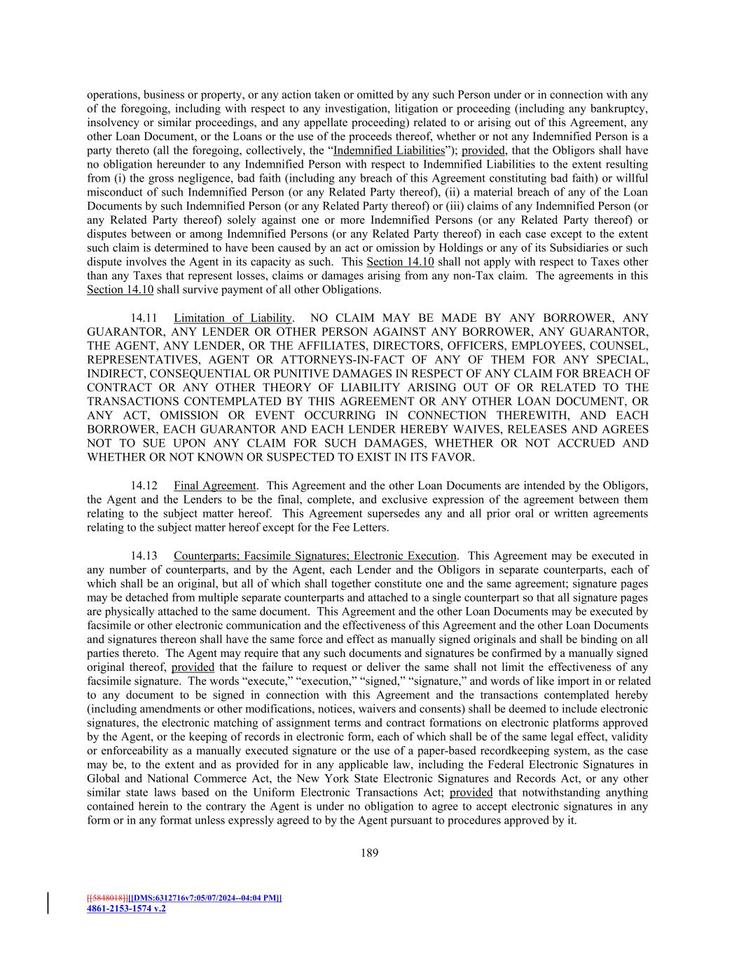 operations, business or property, or any action taken or omitted by any such Person under or in connection with any of the foregoing, including with respect to any investigation, litigation or proceeding (including any bankruptcy, insolvency or similar proceedings, and any appellate proceeding) related to or arising out of this Agreement, any other Loan Document, or the Loans or the use of the proceeds thereof, whether or not any Indemnified Person is a party thereto (all the foregoing, collectively, the “Indemnified Liabilities”); provided, that the Obligors shall have no obligation hereunder to any Indemnified Person with respect to Indemnified Liabilities to the extent resulting from (i) the gross negligence, bad faith (including any breach of this Agreement constituting bad faith) or willful misconduct of such Indemnified Person (or any Related Party thereof), (ii) a material breach of any of the Loan Documents by such Indemnified Person (or any Related Party thereof) or (iii) claims of any Indemnified Person (or any Related Party thereof) solely against one or more Indemnified Persons (or any Related Party thereof) or disputes between or among Indemnified Persons (or any Related Party thereof) in each case except to the extent such claim is determined to have been caused by an act or omission by Holdings or any of its Subsidiaries or such dispute involves the Agent in its capacity as such. This Section 14.10 shall not apply with respect to Taxes other than any Taxes that represent losses, claims or damages arising from any non-Tax claim. The agreements in this Section 14.10 shall survive payment of all other Obligations. 14.11 Limitation of Liability. NO CLAIM MAY BE MADE BY ANY BORROWER, ANY GUARANTOR, ANY LENDER OR OTHER PERSON AGAINST ANY BORROWER, ANY GUARANTOR, THE AGENT, ANY LENDER, OR THE AFFILIATES, DIRECTORS, OFFICERS, EMPLOYEES, COUNSEL, REPRESENTATIVES, AGENT OR ATTORNEYS-IN-FACT OF ANY OF THEM FOR ANY SPECIAL, INDIRECT, CONSEQUENTIAL OR PUNITIVE DAMAGES IN RESPECT OF ANY CLAIM FOR BREACH OF CONTRACT OR ANY OTHER THEORY OF LIABILITY ARISING OUT OF OR RELATED TO THE TRANSACTIONS CONTEMPLATED BY THIS AGREEMENT OR ANY OTHER LOAN DOCUMENT, OR ANY ACT, OMISSION OR EVENT OCCURRING IN CONNECTION THEREWITH, AND EACH BORROWER, EACH GUARANTOR AND EACH LENDER HEREBY WAIVES, RELEASES AND AGREES NOT TO SUE UPON ANY CLAIM FOR SUCH DAMAGES, WHETHER OR NOT ACCRUED AND WHETHER OR NOT KNOWN OR SUSPECTED TO EXIST IN ITS FAVOR. 14.12 Final Agreement. This Agreement and the other Loan Documents are intended by the Obligors, the Agent and the Lenders to be the final, complete, and exclusive expression of the agreement between them relating to the subject matter hereof. This Agreement supersedes any and all prior oral or written agreements relating to the subject matter hereof except for the Fee Letters. 14.13 Counterparts; Facsimile Signatures; Electronic Execution. This Agreement may be executed in any number of counterparts, and by the Agent, each Lender and the Obligors in separate counterparts, each of which shall be an original, but all of which shall together constitute one and the same agreement; signature pages may be detached from multiple separate counterparts and attached to a single counterpart so that all signature pages are physically attached to the same document. This Agreement and the other Loan Documents may be executed by facsimile or other electronic communication and the effectiveness of this Agreement and the other Loan Documents and signatures thereon shall have the same force and effect as manually signed originals and shall be binding on all parties thereto. The Agent may require that any such documents and signatures be confirmed by a manually signed original thereof, provided that the failure to request or deliver the same shall not limit the effectiveness of any facsimile signature. The words “execute,” “execution,” “signed,” “signature,” and words of like import in or related to any document to be signed in connection with this Agreement and the transactions contemplated hereby (including amendments or other modifications, notices, waivers and consents) shall be deemed to include electronic signatures, the electronic matching of assignment terms and contract formations on electronic platforms approved by the Agent, or the keeping of records in electronic form, each of which shall be of the same legal effect, validity or enforceability as a manually executed signature or the use of a paper-based recordkeeping system, as the case may be, to the extent and as provided for in any applicable law, including the Federal Electronic Signatures in Global and National Commerce Act, the New York State Electronic Signatures and Records Act, or any other similar state laws based on the Uniform Electronic Transactions Act; provided that notwithstanding anything contained herein to the contrary the Agent is under no obligation to agree to accept electronic signatures in any form or in any format unless expressly agreed to by the Agent pursuant to procedures approved by it. 189 [[5848018]][[DMS:6312716v7:05/07/2024--04:04 PM]] 4861-2153-1574 v.2