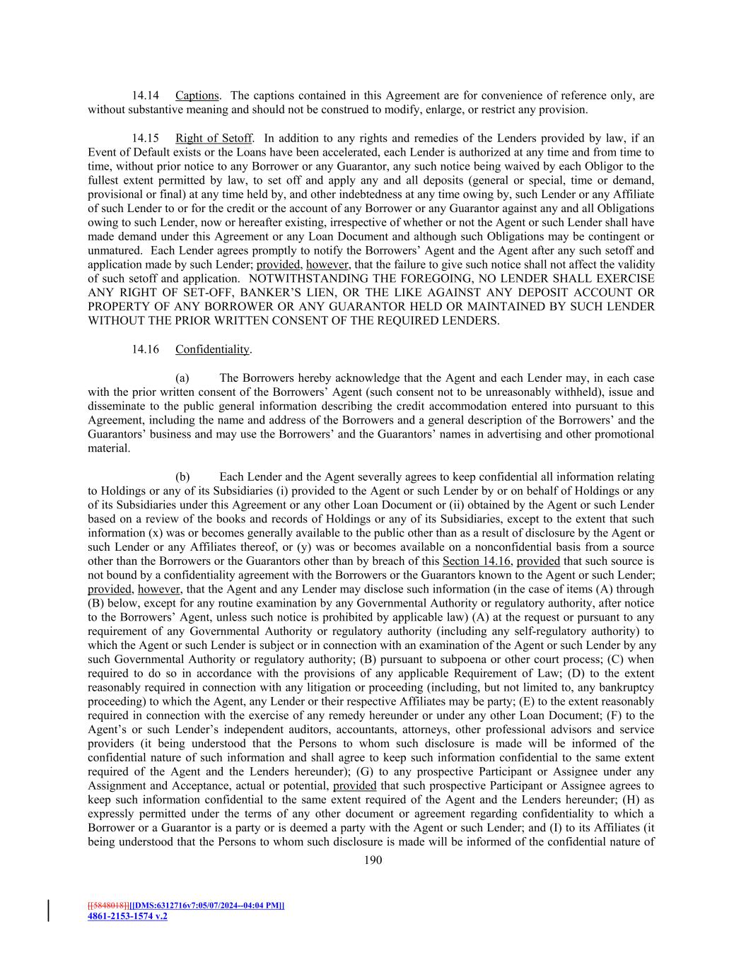 14.14 Captions. The captions contained in this Agreement are for convenience of reference only, are without substantive meaning and should not be construed to modify, enlarge, or restrict any provision. 14.15 Right of Setoff. In addition to any rights and remedies of the Lenders provided by law, if an Event of Default exists or the Loans have been accelerated, each Lender is authorized at any time and from time to time, without prior notice to any Borrower or any Guarantor, any such notice being waived by each Obligor to the fullest extent permitted by law, to set off and apply any and all deposits (general or special, time or demand, provisional or final) at any time held by, and other indebtedness at any time owing by, such Lender or any Affiliate of such Lender to or for the credit or the account of any Borrower or any Guarantor against any and all Obligations owing to such Lender, now or hereafter existing, irrespective of whether or not the Agent or such Lender shall have made demand under this Agreement or any Loan Document and although such Obligations may be contingent or unmatured. Each Lender agrees promptly to notify the Borrowers’ Agent and the Agent after any such setoff and application made by such Lender; provided, however, that the failure to give such notice shall not affect the validity of such setoff and application. NOTWITHSTANDING THE FOREGOING, NO LENDER SHALL EXERCISE ANY RIGHT OF SET-OFF, BANKER’S LIEN, OR THE LIKE AGAINST ANY DEPOSIT ACCOUNT OR PROPERTY OF ANY BORROWER OR ANY GUARANTOR HELD OR MAINTAINED BY SUCH LENDER WITHOUT THE PRIOR WRITTEN CONSENT OF THE REQUIRED LENDERS. 14.16 Confidentiality. (a) The Borrowers hereby acknowledge that the Agent and each Lender may, in each case with the prior written consent of the Borrowers’ Agent (such consent not to be unreasonably withheld), issue and disseminate to the public general information describing the credit accommodation entered into pursuant to this Agreement, including the name and address of the Borrowers and a general description of the Borrowers’ and the Guarantors’ business and may use the Borrowers’ and the Guarantors’ names in advertising and other promotional material. (b) Each Lender and the Agent severally agrees to keep confidential all information relating to Holdings or any of its Subsidiaries (i) provided to the Agent or such Lender by or on behalf of Holdings or any of its Subsidiaries under this Agreement or any other Loan Document or (ii) obtained by the Agent or such Lender based on a review of the books and records of Holdings or any of its Subsidiaries, except to the extent that such information (x) was or becomes generally available to the public other than as a result of disclosure by the Agent or such Lender or any Affiliates thereof, or (y) was or becomes available on a nonconfidential basis from a source other than the Borrowers or the Guarantors other than by breach of this Section 14.16, provided that such source is not bound by a confidentiality agreement with the Borrowers or the Guarantors known to the Agent or such Lender; provided, however, that the Agent and any Lender may disclose such information (in the case of items (A) through (B) below, except for any routine examination by any Governmental Authority or regulatory authority, after notice to the Borrowers’ Agent, unless such notice is prohibited by applicable law) (A) at the request or pursuant to any requirement of any Governmental Authority or regulatory authority (including any self-regulatory authority) to which the Agent or such Lender is subject or in connection with an examination of the Agent or such Lender by any such Governmental Authority or regulatory authority; (B) pursuant to subpoena or other court process; (C) when required to do so in accordance with the provisions of any applicable Requirement of Law; (D) to the extent reasonably required in connection with any litigation or proceeding (including, but not limited to, any bankruptcy proceeding) to which the Agent, any Lender or their respective Affiliates may be party; (E) to the extent reasonably required in connection with the exercise of any remedy hereunder or under any other Loan Document; (F) to the Agent’s or such Lender’s independent auditors, accountants, attorneys, other professional advisors and service providers (it being understood that the Persons to whom such disclosure is made will be informed of the confidential nature of such information and shall agree to keep such information confidential to the same extent required of the Agent and the Lenders hereunder); (G) to any prospective Participant or Assignee under any Assignment and Acceptance, actual or potential, provided that such prospective Participant or Assignee agrees to keep such information confidential to the same extent required of the Agent and the Lenders hereunder; (H) as expressly permitted under the terms of any other document or agreement regarding confidentiality to which a Borrower or a Guarantor is a party or is deemed a party with the Agent or such Lender; and (I) to its Affiliates (it being understood that the Persons to whom such disclosure is made will be informed of the confidential nature of 190 [[5848018]][[DMS:6312716v7:05/07/2024--04:04 PM]] 4861-2153-1574 v.2
