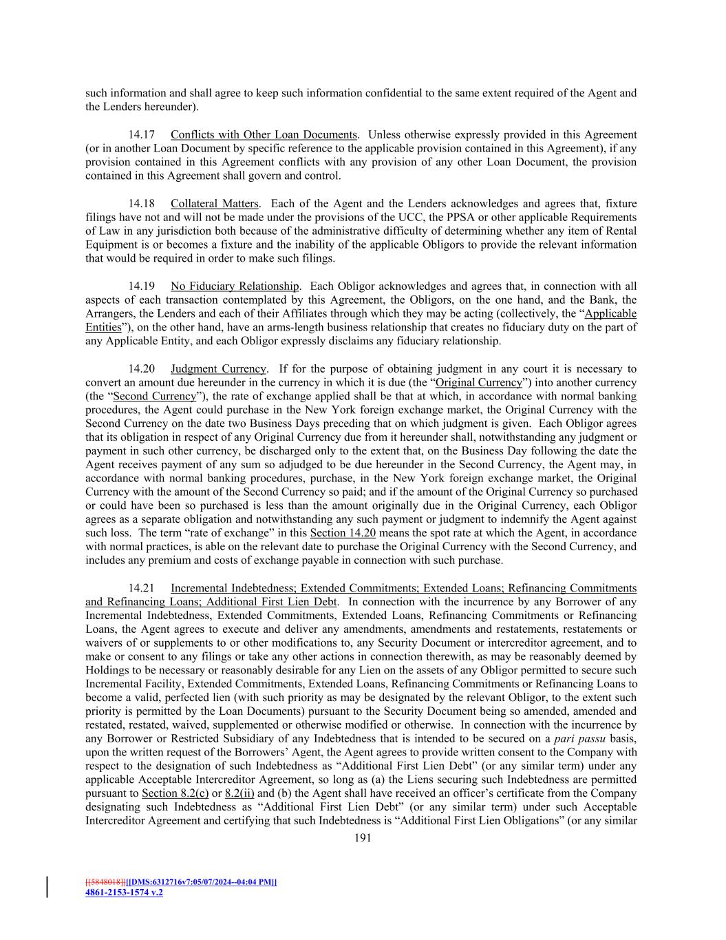 such information and shall agree to keep such information confidential to the same extent required of the Agent and the Lenders hereunder). 14.17 Conflicts with Other Loan Documents. Unless otherwise expressly provided in this Agreement (or in another Loan Document by specific reference to the applicable provision contained in this Agreement), if any provision contained in this Agreement conflicts with any provision of any other Loan Document, the provision contained in this Agreement shall govern and control. 14.18 Collateral Matters. Each of the Agent and the Lenders acknowledges and agrees that, fixture filings have not and will not be made under the provisions of the UCC, the PPSA or other applicable Requirements of Law in any jurisdiction both because of the administrative difficulty of determining whether any item of Rental Equipment is or becomes a fixture and the inability of the applicable Obligors to provide the relevant information that would be required in order to make such filings. 14.19 No Fiduciary Relationship. Each Obligor acknowledges and agrees that, in connection with all aspects of each transaction contemplated by this Agreement, the Obligors, on the one hand, and the Bank, the Arrangers, the Lenders and each of their Affiliates through which they may be acting (collectively, the “Applicable Entities”), on the other hand, have an arms-length business relationship that creates no fiduciary duty on the part of any Applicable Entity, and each Obligor expressly disclaims any fiduciary relationship. 14.20 Judgment Currency. If for the purpose of obtaining judgment in any court it is necessary to convert an amount due hereunder in the currency in which it is due (the “Original Currency”) into another currency (the “Second Currency”), the rate of exchange applied shall be that at which, in accordance with normal banking procedures, the Agent could purchase in the New York foreign exchange market, the Original Currency with the Second Currency on the date two Business Days preceding that on which judgment is given. Each Obligor agrees that its obligation in respect of any Original Currency due from it hereunder shall, notwithstanding any judgment or payment in such other currency, be discharged only to the extent that, on the Business Day following the date the Agent receives payment of any sum so adjudged to be due hereunder in the Second Currency, the Agent may, in accordance with normal banking procedures, purchase, in the New York foreign exchange market, the Original Currency with the amount of the Second Currency so paid; and if the amount of the Original Currency so purchased or could have been so purchased is less than the amount originally due in the Original Currency, each Obligor agrees as a separate obligation and notwithstanding any such payment or judgment to indemnify the Agent against such loss. The term “rate of exchange” in this Section 14.20 means the spot rate at which the Agent, in accordance with normal practices, is able on the relevant date to purchase the Original Currency with the Second Currency, and includes any premium and costs of exchange payable in connection with such purchase. 14.21 Incremental Indebtedness; Extended Commitments; Extended Loans; Refinancing Commitments and Refinancing Loans; Additional First Lien Debt. In connection with the incurrence by any Borrower of any Incremental Indebtedness, Extended Commitments, Extended Loans, Refinancing Commitments or Refinancing Loans, the Agent agrees to execute and deliver any amendments, amendments and restatements, restatements or waivers of or supplements to or other modifications to, any Security Document or intercreditor agreement, and to make or consent to any filings or take any other actions in connection therewith, as may be reasonably deemed by Holdings to be necessary or reasonably desirable for any Lien on the assets of any Obligor permitted to secure such Incremental Facility, Extended Commitments, Extended Loans, Refinancing Commitments or Refinancing Loans to become a valid, perfected lien (with such priority as may be designated by the relevant Obligor, to the extent such priority is permitted by the Loan Documents) pursuant to the Security Document being so amended, amended and restated, restated, waived, supplemented or otherwise modified or otherwise. In connection with the incurrence by any Borrower or Restricted Subsidiary of any Indebtedness that is intended to be secured on a pari passu basis, upon the written request of the Borrowers’ Agent, the Agent agrees to provide written consent to the Company with respect to the designation of such Indebtedness as “Additional First Lien Debt” (or any similar term) under any applicable Acceptable Intercreditor Agreement, so long as (a) the Liens securing such Indebtedness are permitted pursuant to Section 8.2(c) or 8.2(ii) and (b) the Agent shall have received an officer’s certificate from the Company designating such Indebtedness as “Additional First Lien Debt” (or any similar term) under such Acceptable Intercreditor Agreement and certifying that such Indebtedness is “Additional First Lien Obligations” (or any similar 191 [[5848018]][[DMS:6312716v7:05/07/2024--04:04 PM]] 4861-2153-1574 v.2