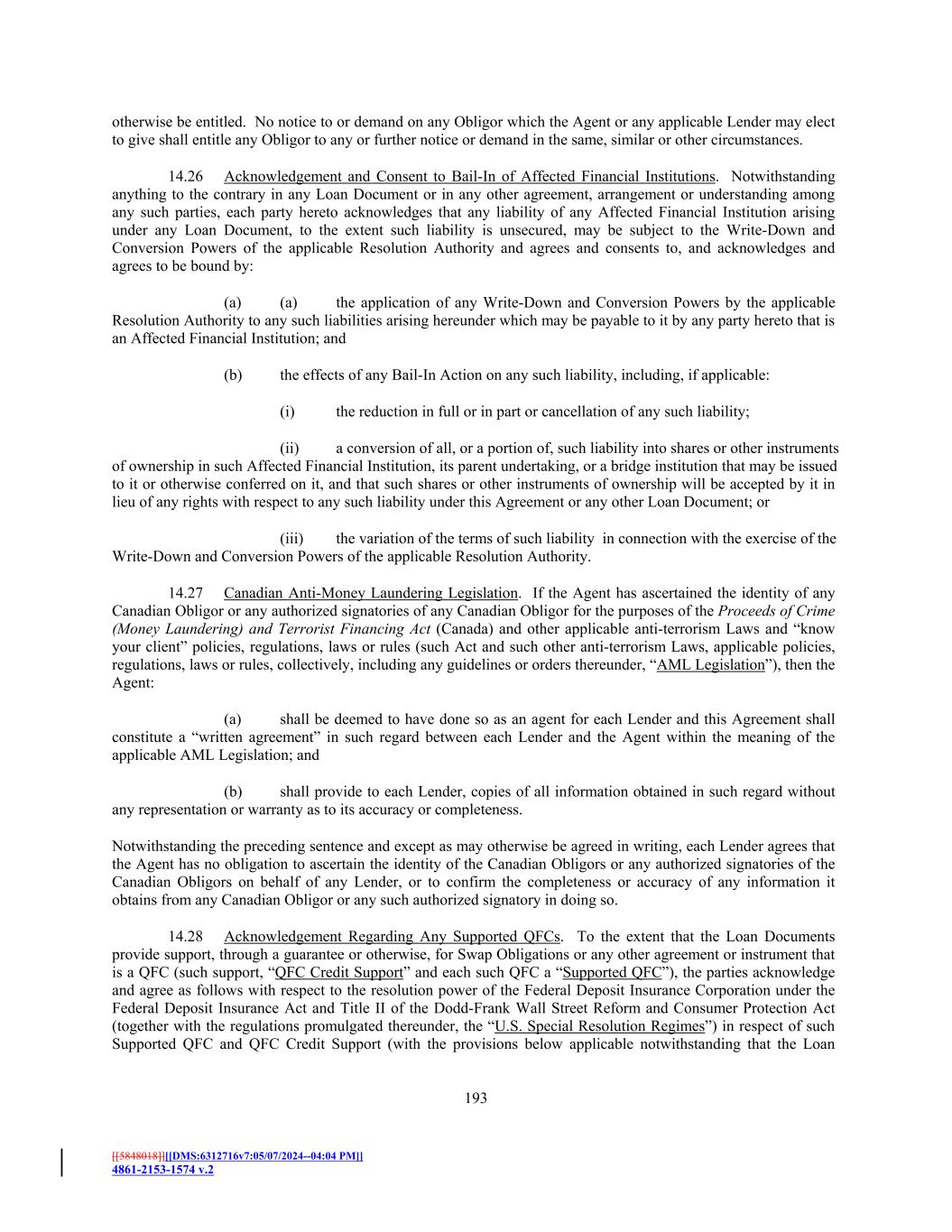 otherwise be entitled. No notice to or demand on any Obligor which the Agent or any applicable Lender may elect to give shall entitle any Obligor to any or further notice or demand in the same, similar or other circumstances. 14.26 Acknowledgement and Consent to Bail-In of Affected Financial Institutions. Notwithstanding anything to the contrary in any Loan Document or in any other agreement, arrangement or understanding among any such parties, each party hereto acknowledges that any liability of any Affected Financial Institution arising under any Loan Document, to the extent such liability is unsecured, may be subject to the Write-Down and Conversion Powers of the applicable Resolution Authority and agrees and consents to, and acknowledges and agrees to be bound by: (a) (a) the application of any Write-Down and Conversion Powers by the applicable Resolution Authority to any such liabilities arising hereunder which may be payable to it by any party hereto that is an Affected Financial Institution; and (b) the effects of any Bail-In Action on any such liability, including, if applicable: (i) the reduction in full or in part or cancellation of any such liability; (ii) a conversion of all, or a portion of, such liability into shares or other instruments of ownership in such Affected Financial Institution, its parent undertaking, or a bridge institution that may be issued to it or otherwise conferred on it, and that such shares or other instruments of ownership will be accepted by it in lieu of any rights with respect to any such liability under this Agreement or any other Loan Document; or (iii) the variation of the terms of such liability in connection with the exercise of the Write-Down and Conversion Powers of the applicable Resolution Authority. 14.27 Canadian Anti-Money Laundering Legislation. If the Agent has ascertained the identity of any Canadian Obligor or any authorized signatories of any Canadian Obligor for the purposes of the Proceeds of Crime (Money Laundering) and Terrorist Financing Act (Canada) and other applicable anti-terrorism Laws and “know your client” policies, regulations, laws or rules (such Act and such other anti-terrorism Laws, applicable policies, regulations, laws or rules, collectively, including any guidelines or orders thereunder, “AML Legislation”), then the Agent: (a) shall be deemed to have done so as an agent for each Lender and this Agreement shall constitute a “written agreement” in such regard between each Lender and the Agent within the meaning of the applicable AML Legislation; and (b) shall provide to each Lender, copies of all information obtained in such regard without any representation or warranty as to its accuracy or completeness. Notwithstanding the preceding sentence and except as may otherwise be agreed in writing, each Lender agrees that the Agent has no obligation to ascertain the identity of the Canadian Obligors or any authorized signatories of the Canadian Obligors on behalf of any Lender, or to confirm the completeness or accuracy of any information it obtains from any Canadian Obligor or any such authorized signatory in doing so. 14.28 Acknowledgement Regarding Any Supported QFCs. To the extent that the Loan Documents provide support, through a guarantee or otherwise, for Swap Obligations or any other agreement or instrument that is a QFC (such support, “QFC Credit Support” and each such QFC a “Supported QFC”), the parties acknowledge and agree as follows with respect to the resolution power of the Federal Deposit Insurance Corporation under the Federal Deposit Insurance Act and Title II of the Dodd-Frank Wall Street Reform and Consumer Protection Act (together with the regulations promulgated thereunder, the “U.S. Special Resolution Regimes”) in respect of such Supported QFC and QFC Credit Support (with the provisions below applicable notwithstanding that the Loan 193 [[5848018]][[DMS:6312716v7:05/07/2024--04:04 PM]] 4861-2153-1574 v.2