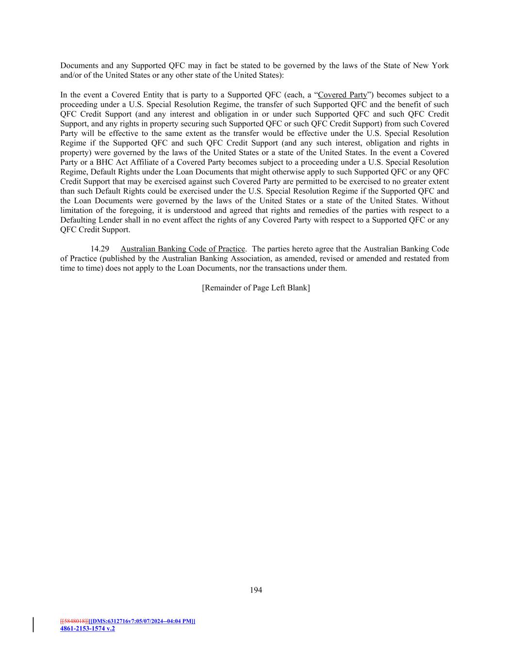 Documents and any Supported QFC may in fact be stated to be governed by the laws of the State of New York and/or of the United States or any other state of the United States): In the event a Covered Entity that is party to a Supported QFC (each, a “Covered Party”) becomes subject to a proceeding under a U.S. Special Resolution Regime, the transfer of such Supported QFC and the benefit of such QFC Credit Support (and any interest and obligation in or under such Supported QFC and such QFC Credit Support, and any rights in property securing such Supported QFC or such QFC Credit Support) from such Covered Party will be effective to the same extent as the transfer would be effective under the U.S. Special Resolution Regime if the Supported QFC and such QFC Credit Support (and any such interest, obligation and rights in property) were governed by the laws of the United States or a state of the United States. In the event a Covered Party or a BHC Act Affiliate of a Covered Party becomes subject to a proceeding under a U.S. Special Resolution Regime, Default Rights under the Loan Documents that might otherwise apply to such Supported QFC or any QFC Credit Support that may be exercised against such Covered Party are permitted to be exercised to no greater extent than such Default Rights could be exercised under the U.S. Special Resolution Regime if the Supported QFC and the Loan Documents were governed by the laws of the United States or a state of the United States. Without limitation of the foregoing, it is understood and agreed that rights and remedies of the parties with respect to a Defaulting Lender shall in no event affect the rights of any Covered Party with respect to a Supported QFC or any QFC Credit Support. 14.29 Australian Banking Code of Practice. The parties hereto agree that the Australian Banking Code of Practice (published by the Australian Banking Association, as amended, revised or amended and restated from time to time) does not apply to the Loan Documents, nor the transactions under them. [Remainder of Page Left Blank] 194 [[5848018]][[DMS:6312716v7:05/07/2024--04:04 PM]] 4861-2153-1574 v.2