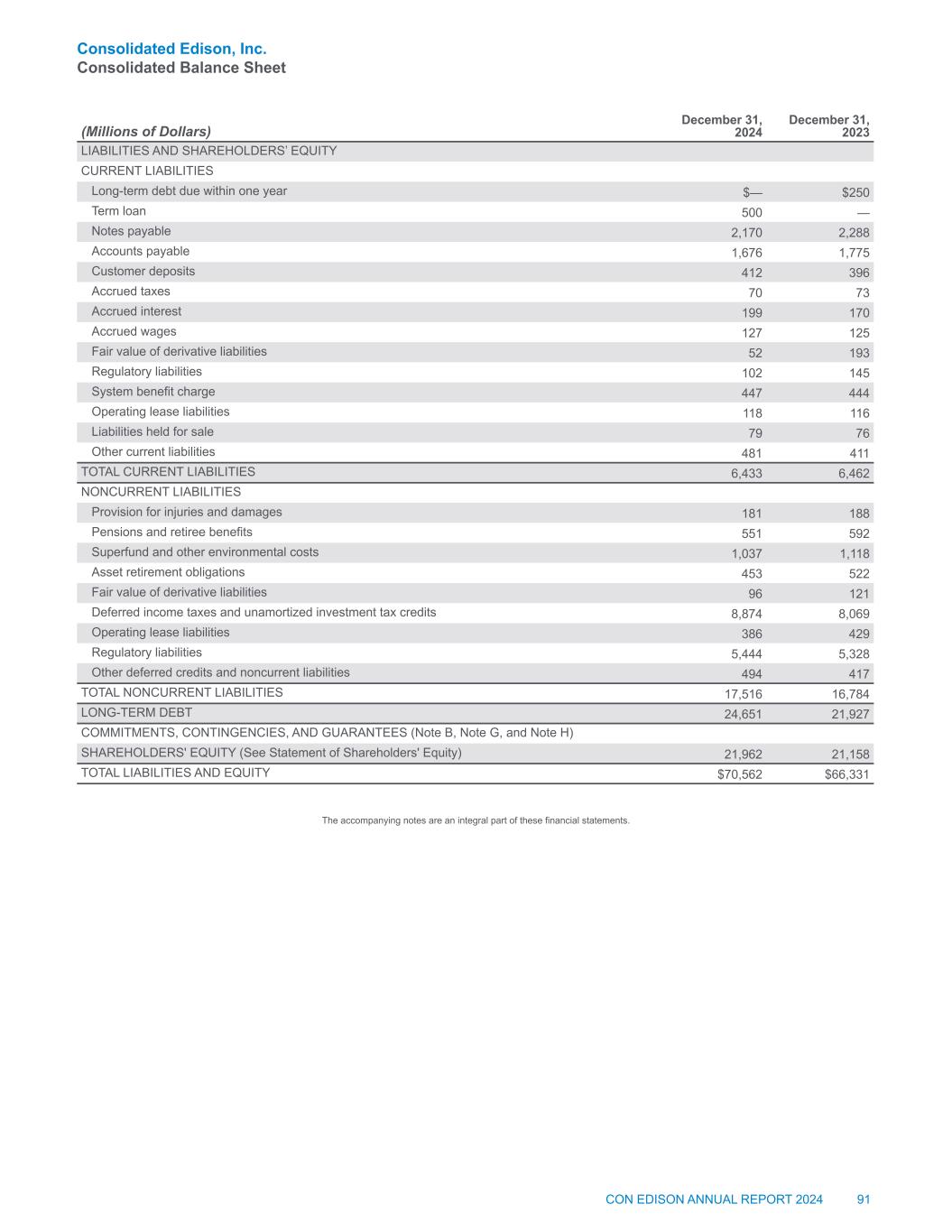 Consolidated Edison Company of New York, Inc. Consolidated Balance Sheet (Millions of Dollars) December 31, 2024 December 31, 2023 LIABILITIES AND SHAREHOLDER’S EQUITY CURRENT LIABILITIES Long-term debt due within one year $— $250 Term Loan 500 — Notes payable 1,694 1,903 Accounts payable 1,534 1,629 Accounts payable to affiliated companies 22 16 Customer deposits 397 378 Accrued taxes 65 55 Accrued taxes to affiliated companies 1 1 Accrued interest 185 159 Accrued wages 116 114 Fair value of derivative liabilities 44 179 Regulatory liabilities 40 107 System benefit charge 406 406 Operating lease liabilities 118 116 Other current liabilities 437 381 TOTAL CURRENT LIABILITIES 5,559 5,694 NONCURRENT LIABILITIES Provision for injuries and damages 176 185 Pensions and retiree benefits 506 542 Superfund and other environmental costs 942 1,026 Asset retirement obligations 452 520 Fair value of derivative liabilities 84 108 Deferred income taxes and unamortized investment tax credits 8,819 7,984 Operating lease liabilities 386 429 Regulatory liabilities 4,940 4,818 Other deferred credits and noncurrent liabilities 406 338 TOTAL NONCURRENT LIABILITIES 16,711 15,950 LONG-TERM DEBT 23,409 20,810 COMMITMENTS AND CONTINGENCIES (Note B and Note G) SHAREHOLDER’S EQUITY (See Statement of Shareholder’s Equity) 19,971 19,146 TOTAL LIABILITIES AND SHAREHOLDER’S EQUITY $65,650 $61,600 The accompanying notes are an integral part of these financial statements. CON EDISON ANNUAL REPORT 2024 103