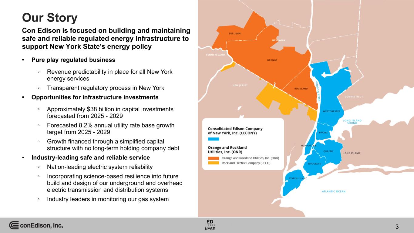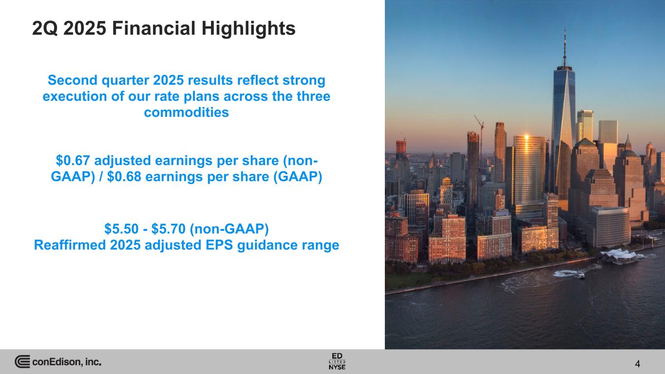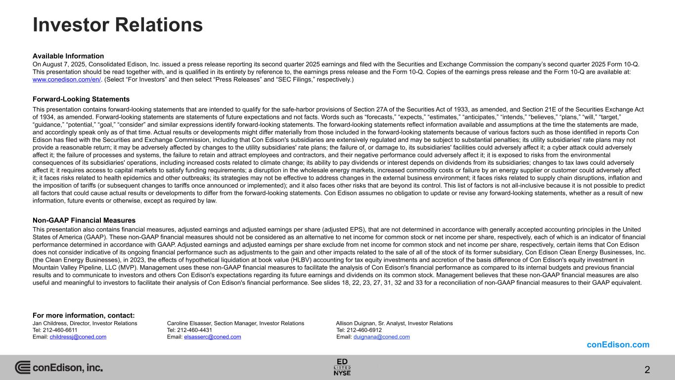 Available Information On August 7, 2025, Consolidated Edison, Inc. issued a press release reporting its second quarter 2025 earnings and filed with the Securities and Exchange Commission the company’s second quarter 2025 Form 10-Q. This presentation should be read together with, and is qualified in its entirety by reference to, the earnings press release and the Form 10-Q. Copies of the earnings press release and the Form 10-Q are available at: www.conedison.com/en/. (Select “For Investors” and then select “Press Releases” and “SEC Filings,” respectively.) Forward-Looking Statements This presentation contains forward-looking statements that are intended to qualify for the safe-harbor provisions of Section 27A of the Securities Act of 1933, as amended, and Section 21E of the Securities Exchange Act of 1934, as amended. Forward-looking statements are statements of future expectations and not facts. Words such as “forecasts,” “expects,” “estimates,” “anticipates,” “intends,” “believes,” “plans,” “will,” “target,” “guidance,” “potential,” “goal,” “consider” and similar expressions identify forward-looking statements. The forward-looking statements reflect information available and assumptions at the time the statements are made, and accordingly speak only as of that time. Actual results or developments might differ materially from those included in the forward-looking statements because of various factors such as those identified in reports Con Edison has filed with the Securities and Exchange Commission, including that Con Edison's subsidiaries are extensively regulated and may be subject to substantial penalties; its utility subsidiaries' rate plans may not provide a reasonable return; it may be adversely affected by changes to the utility subsidiaries' rate plans; the failure of, or damage to, its subsidiaries' facilities could adversely affect it; a cyber attack could adversely affect it; the failure of processes and systems, the failure to retain and attract employees and contractors, and their negative performance could adversely affect it; it is exposed to risks from the environmental consequences of its subsidiaries' operations, including increased costs related to climate change; its ability to pay dividends or interest depends on dividends from its subsidiaries; changes to tax laws could adversely affect it; it requires access to capital markets to satisfy funding requirements; a disruption in the wholesale energy markets, increased commodity costs or failure by an energy supplier or customer could adversely affect it; it faces risks related to health epidemics and other outbreaks; its strategies may not be effective to address changes in the external business environment; it faces risks related to supply chain disruptions, inflation and the imposition of tariffs (or subsequent changes to tariffs once announced or implemented); and it also faces other risks that are beyond its control. This list of factors is not all-inclusive because it is not possible to predict all factors that could cause actual results or developments to differ from the forward-looking statements. Con Edison assumes no obligation to update or revise any forward-looking statements, whether as a result of new information, future events or otherwise, except as required by law. Non-GAAP Financial Measures This presentation also contains financial measures, adjusted earnings and adjusted earnings per share (adjusted EPS), that are not determined in accordance with generally accepted accounting principles in the United States of America (GAAP). These non-GAAP financial measures should not be considered as an alternative to net income for common stock or net income per share, respectively, each of which is an indicator of financial performance determined in accordance with GAAP. Adjusted earnings and adjusted earnings per share exclude from net income for common stock and net income per share, respectively, certain items that Con Edison does not consider indicative of its ongoing financial performance such as adjustments to the gain and other impacts related to the sale of all of the stock of its former subsidiary, Con Edison Clean Energy Businesses, Inc. (the Clean Energy Businesses), in 2023, the effects of hypothetical liquidation at book value (HLBV) accounting for tax equity investments and accretion of the basis difference of Con Edison's equity investment in Mountain Valley Pipeline, LLC (MVP). Management uses these non-GAAP financial measures to facilitate the analysis of Con Edison's financial performance as compared to its internal budgets and previous financial results and to communicate to investors and others Con Edison's expectations regarding its future earnings and dividends on its common stock. Management believes that these non-GAAP financial measures are also useful and meaningful to investors to facilitate their analysis of Con Edison's financial performance. See slides 18, 22, 23, 27, 31, 32 and 33 for a reconciliation of non-GAAP financial measures to their GAAP equivalent. For more information, contact: Jan Childress, Director, Investor Relations Caroline Elsasser, Section Manager, Investor Relations Allison Duignan, Sr. Analyst, Investor Relations Tel: 212-460-6611 Tel: 212-460-4431 Tel: 212-460-6912 Email: childressj@coned.com Email: elsasserc@coned.com Email: duignana@coned.com Investor Relations conEdison.com 2