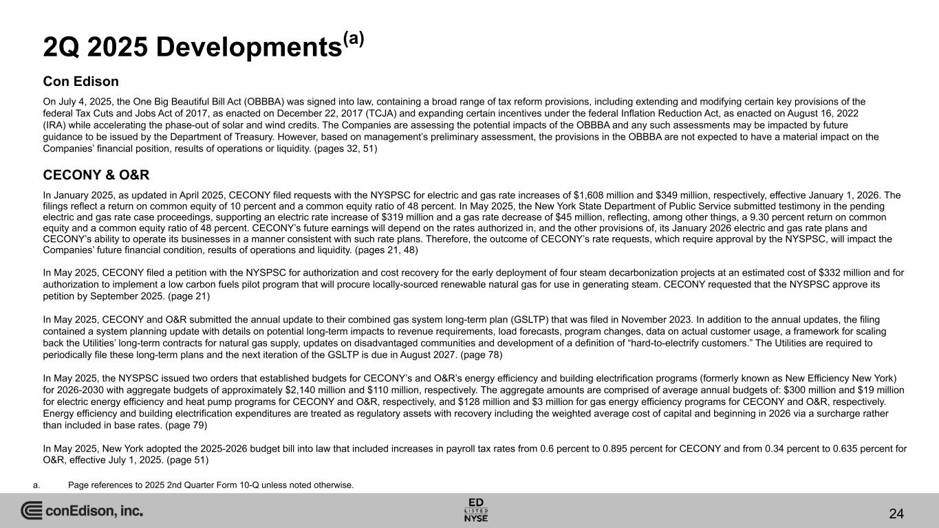 2Q 2025 Developments(a) CECONY & O&R In January 2025, as updated in April 2025, CECONY filed requests with the NYSPSC for electric and gas rate increases of $1,608 million and $349 million, respectively, effective January 1, 2026. The filings reflect a return on common equity of 10 percent and a common equity ratio of 48 percent. In May 2025, the New York State Department of Public Service submitted testimony in the pending electric and gas rate case proceedings, supporting an electric rate increase of $319 million and a gas rate decrease of $45 million, reflecting, among other things, a 9.30 percent return on common equity and a common equity ratio of 48 percent. CECONY’s future earnings will depend on the rates authorized in, and the other provisions of, its January 2026 electric and gas rate plans and CECONY’s ability to operate its businesses in a manner consistent with such rate plans. Therefore, the outcome of CECONY’s rate requests, which require approval by the NYSPSC, will impact the Companies’ future financial condition, results of operations and liquidity. (pages 21, 48) In May 2025, CECONY filed a petition with the NYSPSC for authorization and cost recovery for the early deployment of four steam decarbonization projects at an estimated cost of $332 million and for authorization to implement a low carbon fuels pilot program that will procure locally-sourced renewable natural gas for use in generating steam. CECONY requested that the NYSPSC approve its petition by September 2025. (page 21) In May 2025, CECONY and O&R submitted the annual update to their combined gas system long-term plan (GSLTP) that was filed in November 2023. In addition to the annual updates, the filing contained a system planning update with details on potential long-term impacts to revenue requirements, load forecasts, program changes, data on actual customer usage, a framework for scaling back the Utilities’ long-term contracts for natural gas supply, updates on disadvantaged communities and development of a definition of “hard-to-electrify customers.” The Utilities are required to periodically file these long-term plans and the next iteration of the GSLTP is due in August 2027. (page 78) In May 2025, the NYSPSC issued two orders that established budgets for CECONY’s and O&R’s energy efficiency and building electrification programs (formerly known as New Efficiency New York) for 2026-2030 with aggregate budgets of approximately $2,140 million and $110 million, respectively. The aggregate amounts are comprised of average annual budgets of: $300 million and $19 million for electric energy efficiency and heat pump programs for CECONY and O&R, respectively, and $128 million and $3 million for gas energy efficiency programs for CECONY and O&R, respectively. Energy efficiency and building electrification expenditures are treated as regulatory assets with recovery including the weighted average cost of capital and beginning in 2026 via a surcharge rather than included in base rates. (page 79) In May 2025, New York adopted the 2025-2026 budget bill into law that included increases in payroll tax rates from 0.6 percent to 0.895 percent for CECONY and from 0.34 percent to 0.635 percent for O&R, effective July 1, 2025. (page 51) a. Page references to 2025 2nd Quarter Form 10-Q unless noted otherwise. 24 Con Edison On July 4, 2025, the One Big Beautiful Bill Act (OBBBA) was signed into law, containing a broad range of tax reform provisions, including extending and modifying certain key provisions of the federal Tax Cuts and Jobs Act of 2017, as enacted on December 22, 2017 (TCJA) and expanding certain incentives under the federal Inflation Reduction Act, as enacted on August 16, 2022 (IRA) while accelerating the phase-out of solar and wind credits. The Companies are assessing the potential impacts of the OBBBA and any such assessments may be impacted by future guidance to be issued by the Department of Treasury. However, based on management’s preliminary assessment, the provisions in the OBBBA are not expected to have a material impact on the Companies’ financial position, results of operations or liquidity. (pages 32, 51)