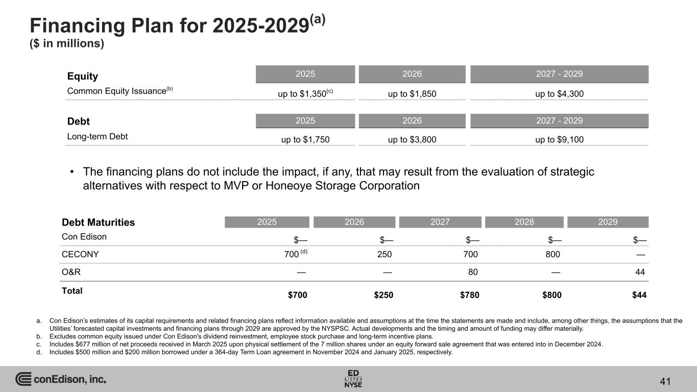 $3,466 $3,635 $4,001 $4,379 $4,699 $5,079 $7,810 $8,107 $8,422 $7,922 2020 2021 2022 2023 2024 2025E 2026E 2027E 2028E 2029E Utilities' Capital Investments Gas Electric Annual CECONY Capital Investments Annual O&R Capital Investments Electric Gas Steam Depreciation Electric Gas Depreciation 2020 $2,080 $1,044 $122 $1,598 $159 $61 $90 2021 2,189 1,126 103 1,705 147 70 95 2022 2,522 1,128 108 1,778 167 76 98 2023 2,909 1,046 128 1,924 211 85 105 2024 3,088 1,154 132 2,037 214 111 117 2025E 3,380 1,113 108 2,347 358 120 130 2026E 5,890 1,269 108 2,370 416 127 135 2027E 6,226 1,250 140 2,554 381 110 155 2028E 6,500 1,235 140 2,781 430 117 174 2029E 6,046 1,151 153 3,114 456 116 186 Steam Depreciation Actual Forecast a. Forecast for 2026, 2027 and 2028 reflects CECONY’s April 2025 updated electric and gas rate filings (Case 25-E-0072 & 25-G-0073) that are subject to approval by the NYSPSC. b. Forecast for 2025, 2026 and 2027 reflects O&R’s Electric and Gas rate plans (Case 24-E-0060 & 24-G-0061) approved in March 2025. c. 2024 Form 10-K, page 30. (a)(b)(c) ($ in millions) 40