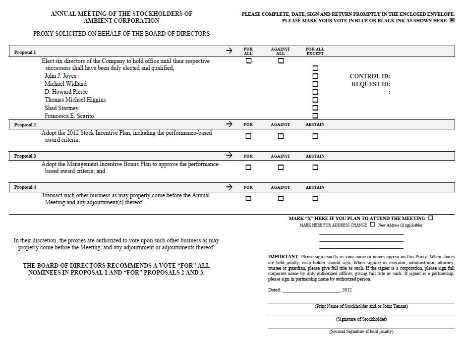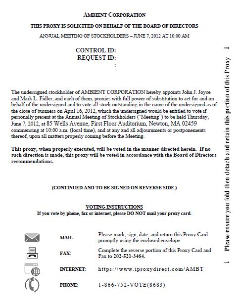 NOTICE IS HEREBY GIVEN that the 2012 Annual Meeting (the “Annual Meeting”) of the stockholders of AMBIENT CORPORATION (the “Company”) will be held at 10:00 a.m. on June 7, 2012 at 85 Wells Avenue, First Floor Auditorium, Newton, MA 02459 to