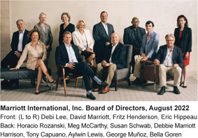 It is an honor to follow in the footsteps of my grandparents, J. Willard and Alice Marriott, and my father, J.W. Marriott, Jr. In my first year as Chairman, I visited over 200 hotels worldwide, met with associates, owners and franchisees, and customers across the globe, and represented the company at numerous internal and external conferences and events. Everywhere I go, I am humbled by the resilience and creativity of the company’s associates. It has been especially rewarding to have members of the board join me for hotel tours, gatherings with local company leaders, and on-property activities like morning housekeeping meetings. These experiences have enriched the board’s understanding of Marriott’s unique culture and the competitive advantage it provides the company.