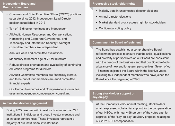 The board is focused on nurturing the culture and core values that are the foundation of the company. In the past year, the board has overseen the company’s work in critical areas, such as reshaping the organization to reflect the company’s global business; investing in associates; transforming the company’s technology to enhance business opportunities and meet the evolving expectations of customers, owners, and franchisees; and driving progress towards the company’s sustainability and social goals, including advancing the company’s plans to set science-based emissions reduction targets and furthering the company’s diversity, equity, and inclusion (DEI) objectives. We are proud of all that the company has accomplished and look forward to working with Tony and his senior leadership team to continue to propel the company forward.