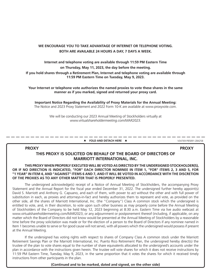 The 2023 annual meeting of stockholders (“Annual Meeting” or “2023 Annual Meeting”) of Marriott International, Inc. (“we,” “us,” “our,” “Marriott,” or the “Company”) will be a virtual meeting held on May 12, 2023, beginning at 8:30 a.m. Eastern Time. Stockholders of record as of the record date may join a live audio webcast at www.virtualshareholdermeeting.com/MAR2023. At the Annual Meeting, stockholders will act on the following items: