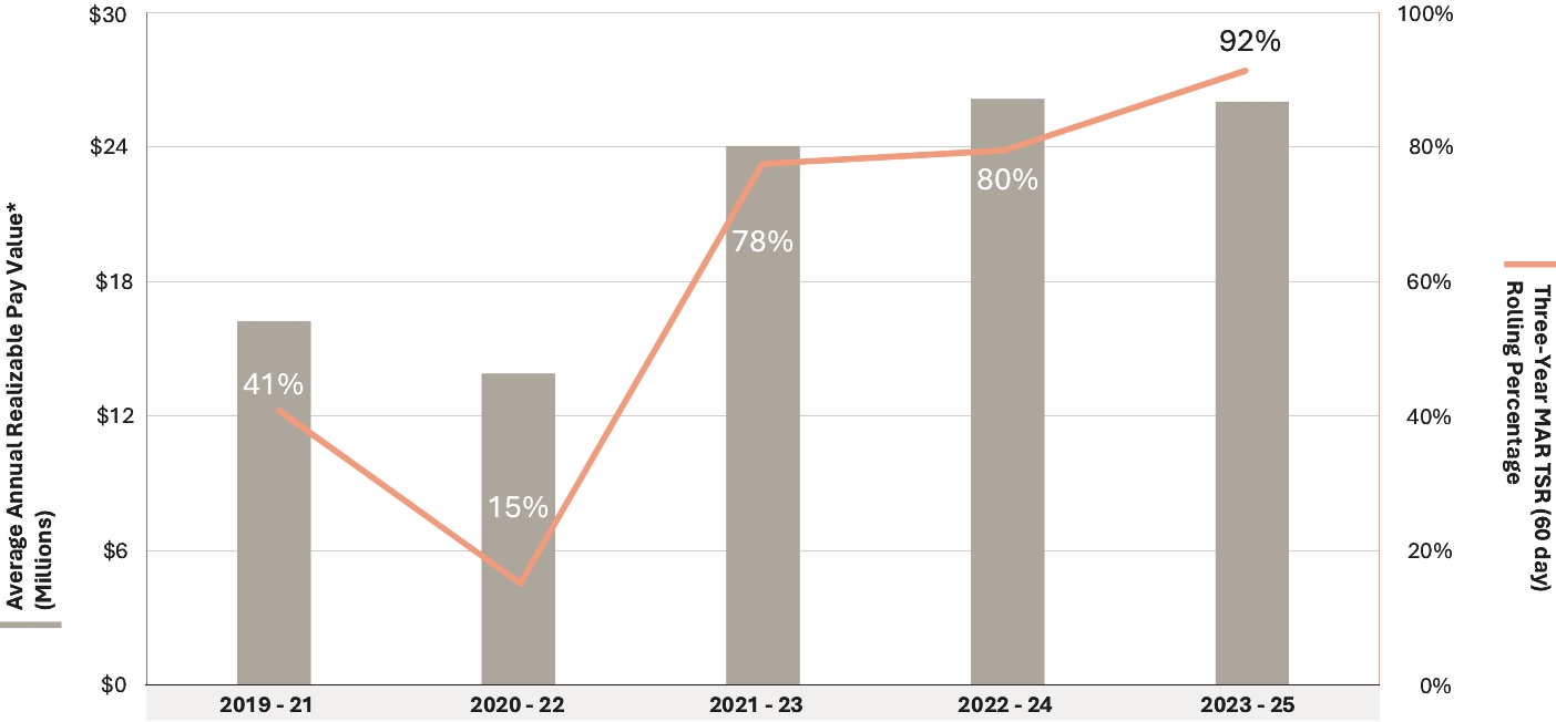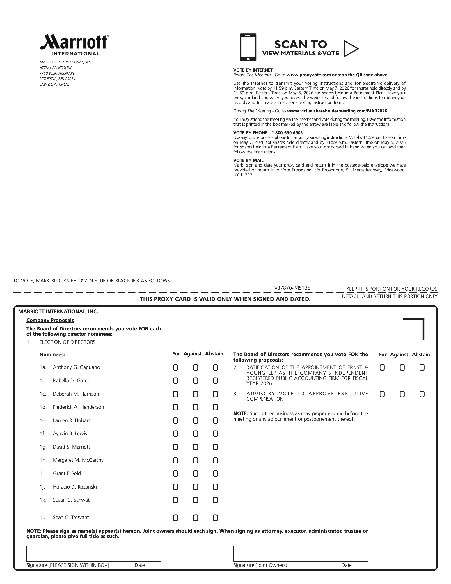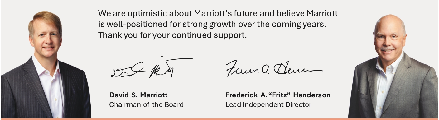Our Company was founded by Mr. J.W. Marriott, Jr.’s parents, and the Board believes that the continued involvement of Marriott family members in responsible positions of the Company makes a significant long-term contribution to the value of our corporate name and identity and to the maintenance of our reputation for providing quality products and services, reinforces the culture and core values that are the bedrock of our success, and promotes associate engagement and retention. In addition to Mr. David S. Marriott’s membership on the Board and role as Chairman of the Board and Mrs. Harrison’s membership on the Board and role as Global Cultural Ambassador Emeritus, the Company employs (or employed in 2025) other members of the Marriott family. From time to time, the Company may also employ family members of other directors or executive officers. The compensation levels of such family members are set based on reference to external market practice for similar positions and/or internal pay equity when compared to the compensation paid to non-family members in similar positions. Employed family members with total compensation for 2025 in excess of $120,000, which includes, to the extent applicable, base salary, bonus, the value of stock-based awards, and all other compensation, were Jennifer Decker Brown, Mr. Brown’s former daughter-in-law, whose total 2025 compensation was $131,517 for her service as Manager, HR Technology; and Matthew Harrison, Mrs. Harrison’s son and Mr. David S. Marriott’s nephew, whose total 2025 compensation was $266,407 for his service as a hotel general manager. No other employed family members’ total compensation for 2025 exceeded $120,000.