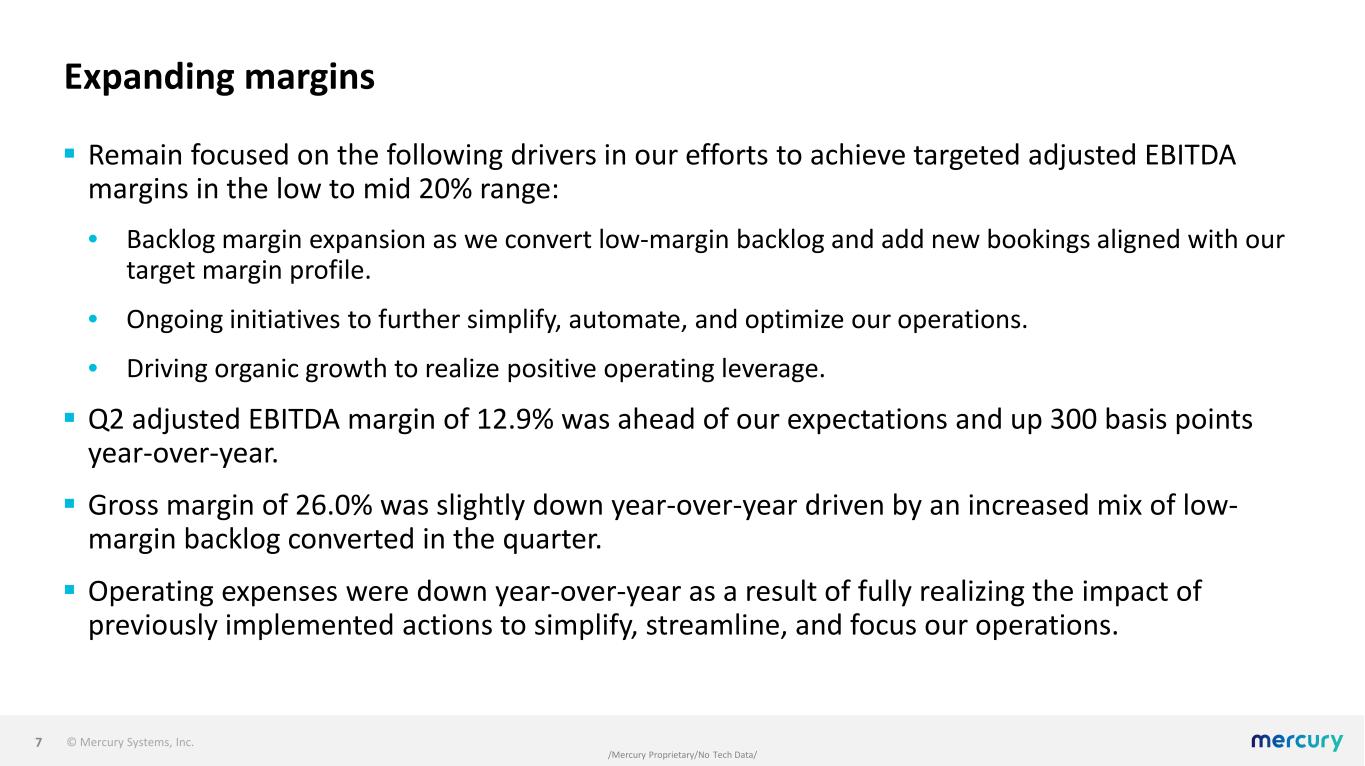 © Mercury Systems, Inc. /Mercury Proprietary/No Tech Data/ Driving organic growth Q2 bookings of $288M resulted in a record backlog approaching $1.5B and a book-to-bill of 1.23. Key contract awards received in the quarter included: • Scope expansion on a long-standing cost-plus development program supporting modernization efforts within a core missile defense platform, extending our role through additional hardware content. • Two key development design wins in exciting growth markets: ̶ Major subsystem supporting a leading advanced air mobility manufacturer’s development of its ground control infrastructure. ̶ Design award supporting a space-based application with a leading aerospace and defense prime, expanding Mercury's capability set within the fast-growing space market. • Multiple follow-on production awards, including incremental quantities on a key U.S. missile franchise, plus additional awards supporting deployed naval platforms and international land-based radar and electronic warfare applications. • $20M of follow-on awards that leverage our Common Processing Architecture and include embedded anti- tamper and cybersecurity software from our recent acquisition of Star Lab. Continued customer discussions on potential incremental demand across multiple programs, driven by rising global defense budgets and priorities such as Golden Dome. 6