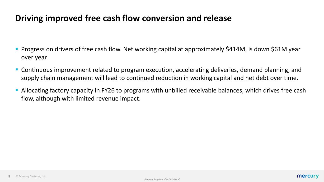 © Mercury Systems, Inc. /Mercury Proprietary/No Tech Data/ Driving improved free cash flow conversion and release Progress on drivers of free cash flow. Net working capital at approximately $414M, is down $61M year over year. Continuous improvement related to program execution, accelerating deliveries, demand planning, and supply chain management will lead to continued reduction in working capital and net debt over time. Allocating factory capacity in FY26 to programs with unbilled receivable balances, which drives free cash flow, although with limited revenue impact. 8