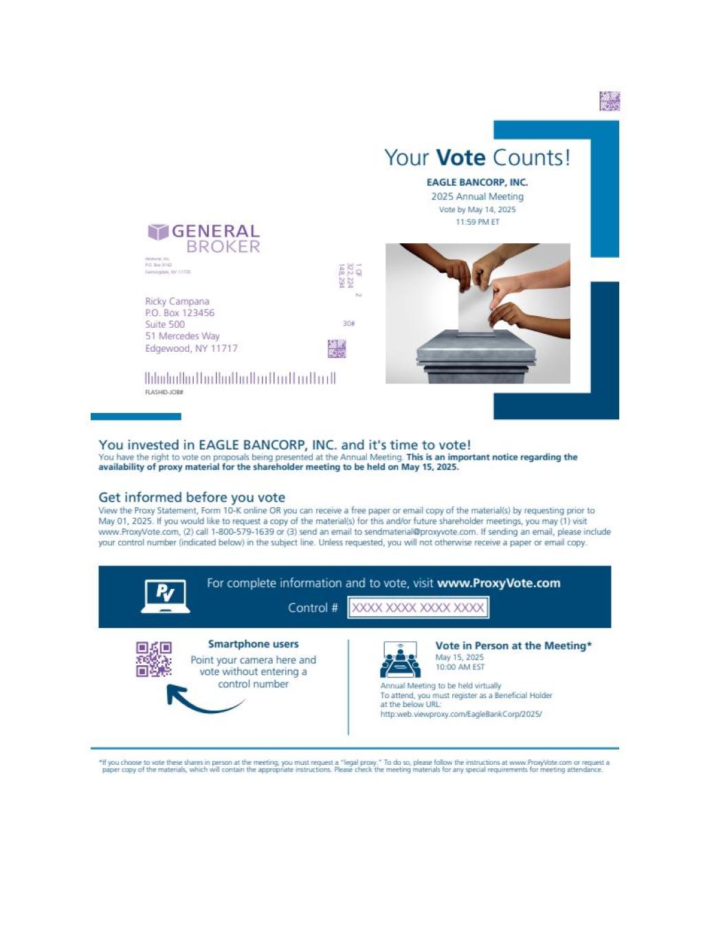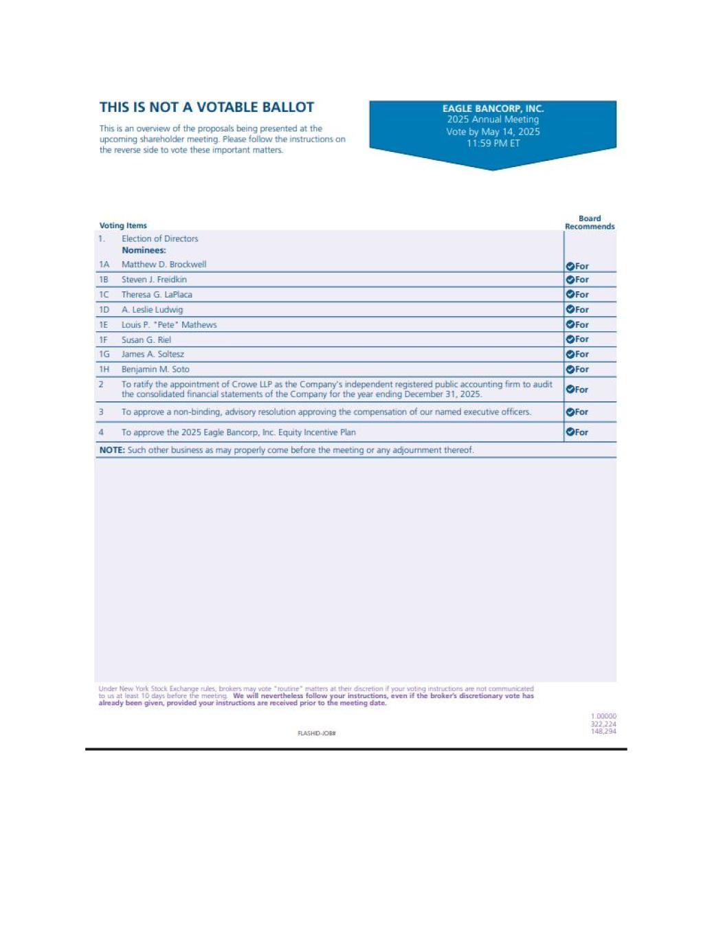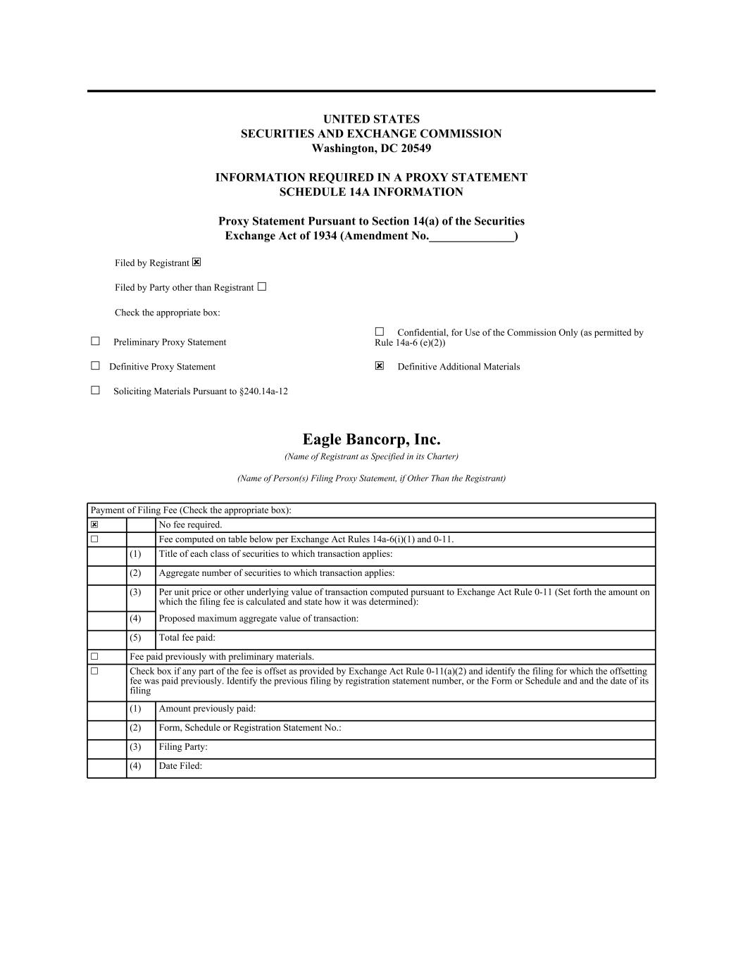 UNITED STATES SECURITIES AND EXCHANGE COMMISSION Washington, DC 20549 INFORMATION REQUIRED IN A PROXY STATEMENT SCHEDULE 14A INFORMATION Proxy Statement Pursuant to Section 14(a) of the Securities Exchange Act of 1934 (Amendment No.______________) Filed by Registrant ☒ Filed by Party other than Registrant ☐ Check the appropriate box: ☐ Preliminary Proxy Statement ☐ Confidential, for Use of the Commission Only (as permitted by Rule 14a-6 (e)(2)) ☐ Definitive Proxy Statement ☒ Definitive Additional Materials ☐ Soliciting Materials Pursuant to §240.14a-12 Eagle Bancorp, Inc. (Name of Registrant as Specified in its Charter) (Name of Person(s) Filing Proxy Statement, if Other Than the Registrant) Payment of Filing Fee (Check the appropriate box): ☒ No fee required. ☐ Fee computed on table below per Exchange Act Rules 14a-6(i)(1) and 0-11. (1) Title of each class of securities to which transaction applies: (2) Aggregate number of securities to which transaction applies: (3) Per unit price or other underlying value of transaction computed pursuant to Exchange Act Rule 0-11 (Set forth the amount on which the filing fee is calculated and state how it was determined): (4) Proposed maximum aggregate value of transaction: (5) Total fee paid: ☐ Fee paid previously with preliminary materials. ☐ Check box if any part of the fee is offset as provided by Exchange Act Rule 0-11(a)(2) and identify the filing for which the offsetting fee was paid previously. Identify the previous filing by registration statement number, or the Form or Schedule and and the date of its filing (1) Amount previously paid: (2) Form, Schedule or Registration Statement No.: (3) Filing Party: (4) Date Filed: