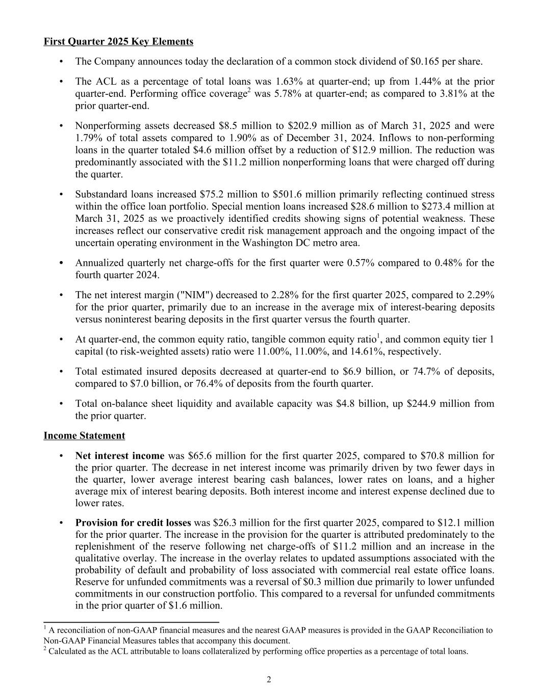 First Quarter 2025 Key Elements • The Company announces today the declaration of a common stock dividend of $0.165 per share. • The ACL as a percentage of total loans was 1.63% at quarter-end; up from 1.44% at the prior quarter-end. Performing office coverage2 was 5.78% at quarter-end; as compared to 3.81% at the prior quarter-end. • Nonperforming assets decreased $8.5 million to $202.9 million as of March 31, 2025 and were 1.79% of total assets compared to 1.90% as of December 31, 2024. Inflows to non-performing loans in the quarter totaled $4.6 million offset by a reduction of $12.9 million. The reduction was predominantly associated with the $11.2 million nonperforming loans that were charged off during the quarter. • Substandard loans increased $75.2 million to $501.6 million primarily reflecting continued stress within the office loan portfolio. Special mention loans increased $28.6 million to $273.4 million at March 31, 2025 as we proactively identified credits showing signs of potential weakness. These increases reflect our conservative credit risk management approach and the ongoing impact of the uncertain operating environment in the Washington DC metro area. • Annualized quarterly net charge-offs for the first quarter were 0.57% compared to 0.48% for the fourth quarter 2024. • The net interest margin ("NIM") decreased to 2.28% for the first quarter 2025, compared to 2.29% for the prior quarter, primarily due to an increase in the average mix of interest-bearing deposits versus noninterest bearing deposits in the first quarter versus the fourth quarter. • At quarter-end, the common equity ratio, tangible common equity ratio1, and common equity tier 1 capital (to risk-weighted assets) ratio were 11.00%, 11.00%, and 14.61%, respectively. • Total estimated insured deposits decreased at quarter-end to $6.9 billion, or 74.7% of deposits, compared to $7.0 billion, or 76.4% of deposits from the fourth quarter. • Total on-balance sheet liquidity and available capacity was $4.8 billion, up $244.9 million from the prior quarter. Income Statement • Net interest income was $65.6 million for the first quarter 2025, compared to $70.8 million for the prior quarter. The decrease in net interest income was primarily driven by two fewer days in the quarter, lower average interest bearing cash balances, lower rates on loans, and a higher average mix of interest bearing deposits. Both interest income and interest expense declined due to lower rates. • Provision for credit losses was $26.3 million for the first quarter 2025, compared to $12.1 million for the prior quarter. The increase in the provision for the quarter is attributed predominately to the replenishment of the reserve following net charge-offs of $11.2 million and an increase in the qualitative overlay. The increase in the overlay relates to updated assumptions associated with the probability of default and probability of loss associated with commercial real estate office loans. Reserve for unfunded commitments was a reversal of $0.3 million due primarily to lower unfunded commitments in our construction portfolio. This compared to a reversal for unfunded commitments in the prior quarter of $1.6 million. 2 1 A reconciliation of non-GAAP financial measures and the nearest GAAP measures is provided in the GAAP Reconciliation to Non-GAAP Financial Measures tables that accompany this document. 2 Calculated as the ACL attributable to loans collateralized by performing office properties as a percentage of total loans.