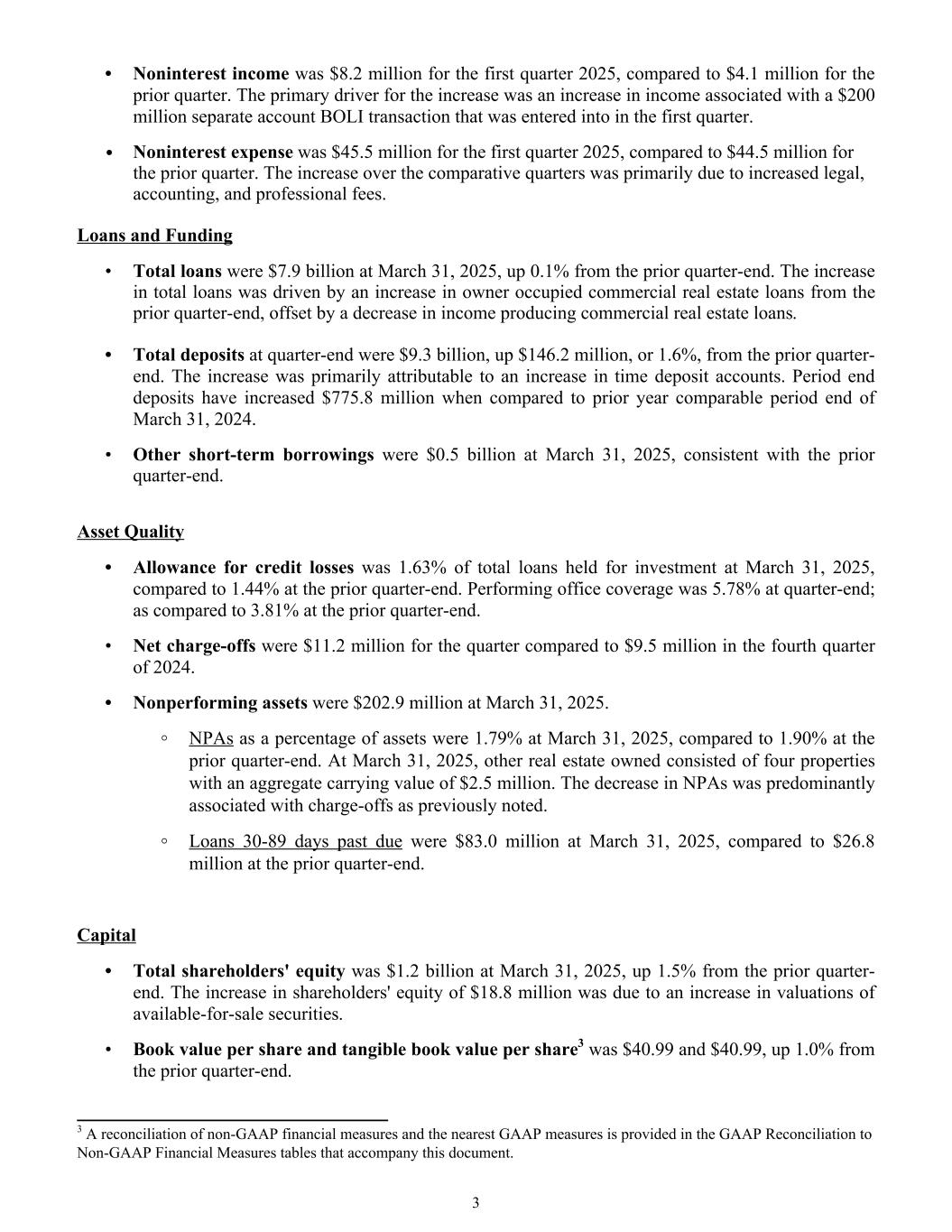 • Noninterest income was $8.2 million for the first quarter 2025, compared to $4.1 million for the prior quarter. The primary driver for the increase was an increase in income associated with a $200 million separate account BOLI transaction that was entered into in the first quarter. • Noninterest expense was $45.5 million for the first quarter 2025, compared to $44.5 million for the prior quarter. The increase over the comparative quarters was primarily due to increased legal, accounting, and professional fees. Loans and Funding • Total loans were $7.9 billion at March 31, 2025, up 0.1% from the prior quarter-end. The increase in total loans was driven by an increase in owner occupied commercial real estate loans from the prior quarter-end, offset by a decrease in income producing commercial real estate loans. • Total deposits at quarter-end were $9.3 billion, up $146.2 million, or 1.6%, from the prior quarter- end. The increase was primarily attributable to an increase in time deposit accounts. Period end deposits have increased $775.8 million when compared to prior year comparable period end of March 31, 2024. • Other short-term borrowings were $0.5 billion at March 31, 2025, consistent with the prior quarter-end. Asset Quality • Allowance for credit losses was 1.63% of total loans held for investment at March 31, 2025, compared to 1.44% at the prior quarter-end. Performing office coverage was 5.78% at quarter-end; as compared to 3.81% at the prior quarter-end. • Net charge-offs were $11.2 million for the quarter compared to $9.5 million in the fourth quarter of 2024. • Nonperforming assets were $202.9 million at March 31, 2025. ◦ NPAs as a percentage of assets were 1.79% at March 31, 2025, compared to 1.90% at the prior quarter-end. At March 31, 2025, other real estate owned consisted of four properties with an aggregate carrying value of $2.5 million. The decrease in NPAs was predominantly associated with charge-offs as previously noted. ◦ Loans 30-89 days past due were $83.0 million at March 31, 2025, compared to $26.8 million at the prior quarter-end. Capital • Total shareholders' equity was $1.2 billion at March 31, 2025, up 1.5% from the prior quarter- end. The increase in shareholders' equity of $18.8 million was due to an increase in valuations of available-for-sale securities. • Book value per share and tangible book value per share3 was $40.99 and $40.99, up 1.0% from the prior quarter-end. 3 3 A reconciliation of non-GAAP financial measures and the nearest GAAP measures is provided in the GAAP Reconciliation to Non-GAAP Financial Measures tables that accompany this document.