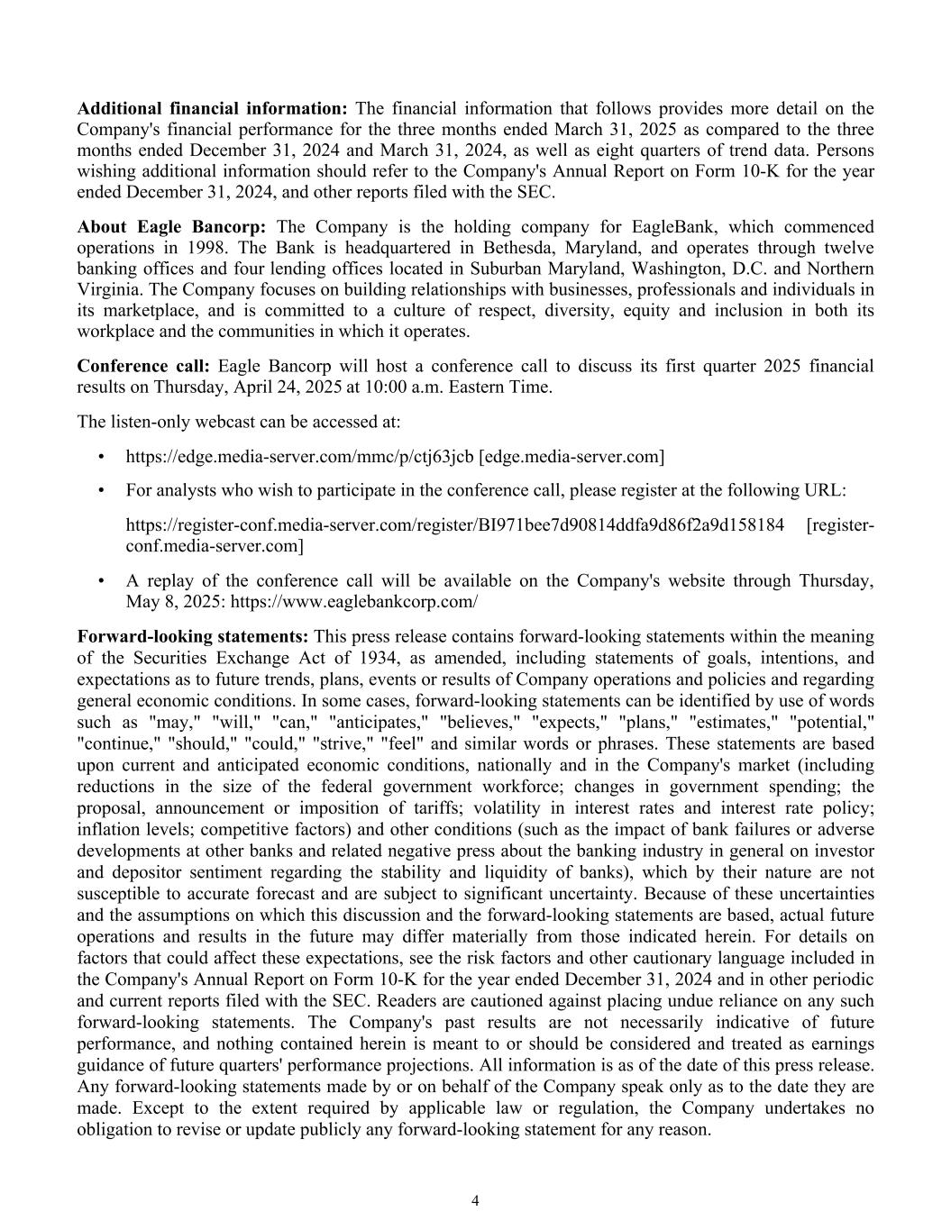 Additional financial information: The financial information that follows provides more detail on the Company's financial performance for the three months ended March 31, 2025 as compared to the three months ended December 31, 2024 and March 31, 2024, as well as eight quarters of trend data. Persons wishing additional information should refer to the Company's Annual Report on Form 10-K for the year ended December 31, 2024, and other reports filed with the SEC. About Eagle Bancorp: The Company is the holding company for EagleBank, which commenced operations in 1998. The Bank is headquartered in Bethesda, Maryland, and operates through twelve banking offices and four lending offices located in Suburban Maryland, Washington, D.C. and Northern Virginia. The Company focuses on building relationships with businesses, professionals and individuals in its marketplace, and is committed to a culture of respect, diversity, equity and inclusion in both its workplace and the communities in which it operates. Conference call: Eagle Bancorp will host a conference call to discuss its first quarter 2025 financial results on Thursday, April 24, 2025 at 10:00 a.m. Eastern Time. The listen-only webcast can be accessed at: • https://edge.media-server.com/mmc/p/ctj63jcb [edge.media-server.com] • For analysts who wish to participate in the conference call, please register at the following URL: https://register-conf.media-server.com/register/BI971bee7d90814ddfa9d86f2a9d158184 [register- conf.media-server.com] • A replay of the conference call will be available on the Company's website through Thursday, May 8, 2025: https://www.eaglebankcorp.com/ Forward-looking statements: This press release contains forward-looking statements within the meaning of the Securities Exchange Act of 1934, as amended, including statements of goals, intentions, and expectations as to future trends, plans, events or results of Company operations and policies and regarding general economic conditions. In some cases, forward-looking statements can be identified by use of words such as "may," "will," "can," "anticipates," "believes," "expects," "plans," "estimates," "potential," "continue," "should," "could," "strive," "feel" and similar words or phrases. These statements are based upon current and anticipated economic conditions, nationally and in the Company's market (including reductions in the size of the federal government workforce; changes in government spending; the proposal, announcement or imposition of tariffs; volatility in interest rates and interest rate policy; inflation levels; competitive factors) and other conditions (such as the impact of bank failures or adverse developments at other banks and related negative press about the banking industry in general on investor and depositor sentiment regarding the stability and liquidity of banks), which by their nature are not susceptible to accurate forecast and are subject to significant uncertainty. Because of these uncertainties and the assumptions on which this discussion and the forward-looking statements are based, actual future operations and results in the future may differ materially from those indicated herein. For details on factors that could affect these expectations, see the risk factors and other cautionary language included in the Company's Annual Report on Form 10-K for the year ended December 31, 2024 and in other periodic and current reports filed with the SEC. Readers are cautioned against placing undue reliance on any such forward-looking statements. The Company's past results are not necessarily indicative of future performance, and nothing contained herein is meant to or should be considered and treated as earnings guidance of future quarters' performance projections. All information is as of the date of this press release. Any forward-looking statements made by or on behalf of the Company speak only as to the date they are made. Except to the extent required by applicable law or regulation, the Company undertakes no obligation to revise or update publicly any forward-looking statement for any reason. 4