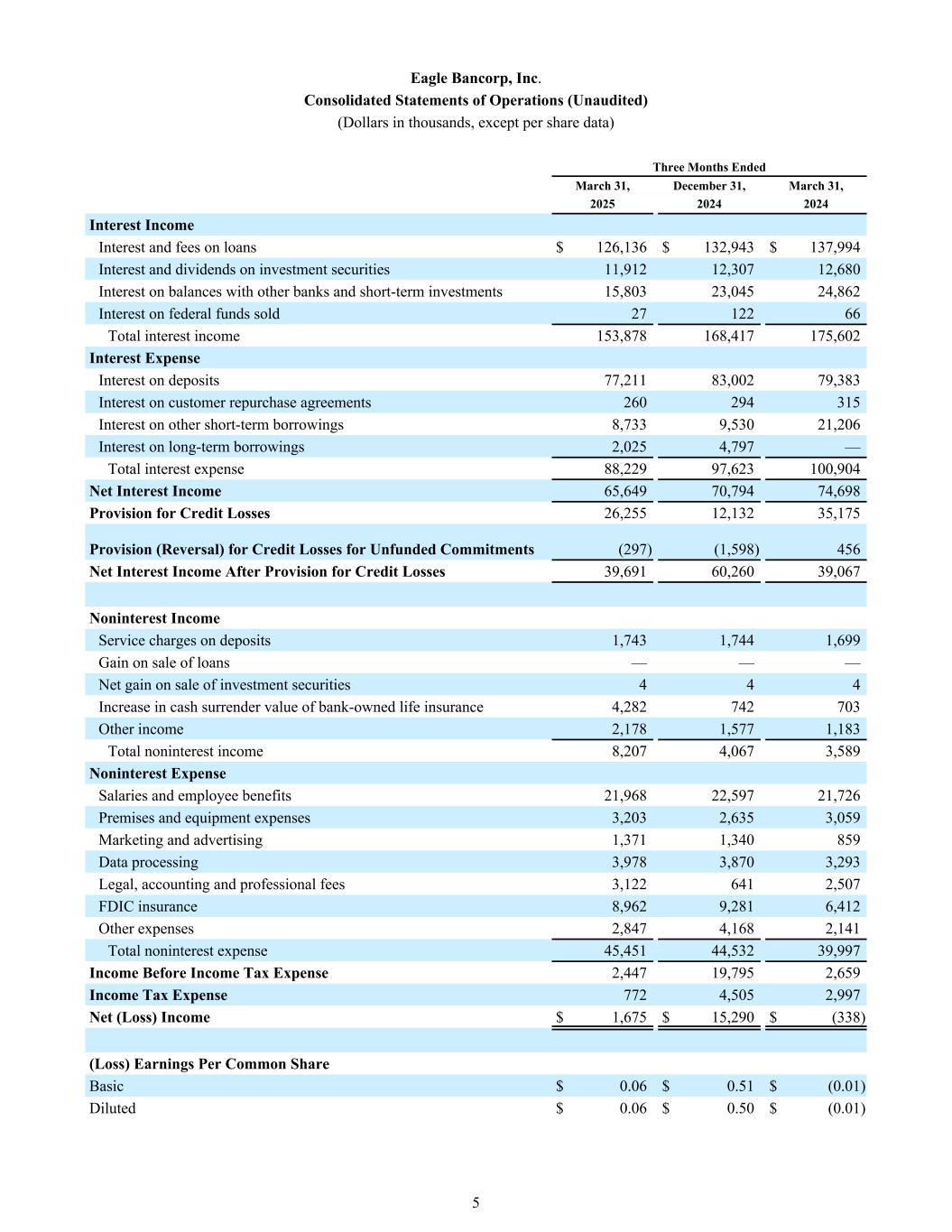 Eagle Bancorp, Inc. Consolidated Statements of Operations (Unaudited) (Dollars in thousands, except per share data) Three Months Ended March 31, December 31, March 31, 2025 2024 2024 Interest Income Interest and fees on loans $ 126,136 $ 132,943 $ 137,994 Interest and dividends on investment securities 11,912 12,307 12,680 Interest on balances with other banks and short-term investments 15,803 23,045 24,862 Interest on federal funds sold 27 122 66 Total interest income 153,878 168,417 175,602 Interest Expense Interest on deposits 77,211 83,002 79,383 Interest on customer repurchase agreements 260 294 315 Interest on other short-term borrowings 8,733 9,530 21,206 Interest on long-term borrowings 2,025 4,797 — Total interest expense 88,229 97,623 100,904 Net Interest Income 65,649 70,794 74,698 Provision for Credit Losses 26,255 12,132 35,175 Provision (Reversal) for Credit Losses for Unfunded Commitments (297) (1,598) 456 Net Interest Income After Provision for Credit Losses 39,691 60,260 39,067 Noninterest Income Service charges on deposits 1,743 1,744 1,699 Gain on sale of loans — — — Net gain on sale of investment securities 4 4 4 Increase in cash surrender value of bank-owned life insurance 4,282 742 703 Other income 2,178 1,577 1,183 Total noninterest income 8,207 4,067 3,589 Noninterest Expense Salaries and employee benefits 21,968 22,597 21,726 Premises and equipment expenses 3,203 2,635 3,059 Marketing and advertising 1,371 1,340 859 Data processing 3,978 3,870 3,293 Legal, accounting and professional fees 3,122 641 2,507 FDIC insurance 8,962 9,281 6,412 Other expenses 2,847 4,168 2,141 Total noninterest expense 45,451 44,532 39,997 Income Before Income Tax Expense 2,447 19,795 2,659 Income Tax Expense 772 4,505 2,997 Net (Loss) Income $ 1,675 $ 15,290 $ (338) (Loss) Earnings Per Common Share Basic $ 0.06 $ 0.51 $ (0.01) Diluted $ 0.06 $ 0.50 $ (0.01) 5