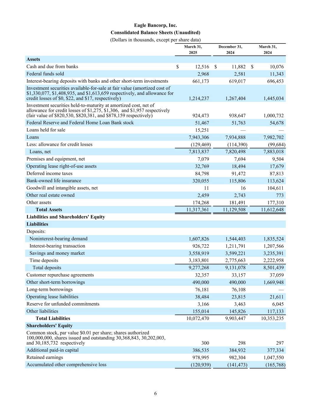 Eagle Bancorp, Inc. Consolidated Balance Sheets (Unaudited) (Dollars in thousands, except per share data) March 31, December 31, March 31, 2025 2024 2024 Assets Cash and due from banks $ 12,516 $ 11,882 $ 10,076 Federal funds sold 2,968 2,581 11,343 Interest-bearing deposits with banks and other short-term investments 661,173 619,017 696,453 Investment securities available-for-sale at fair value (amortized cost of $1,330,077, $1,408,935, and $1,613,659 respectively, and allowance for credit losses of $0, $22, and $17, respectively) 1,214,237 1,267,404 1,445,034 Investment securities held-to-maturity at amortized cost, net of allowance for credit losses of $1,275, $1,306, and $1,957 respectively (fair value of $820,530, $820,381, and $878,159 respectively) 924,473 938,647 1,000,732 Federal Reserve and Federal Home Loan Bank stock 51,467 51,763 54,678 Loans held for sale 15,251 — — Loans 7,943,306 7,934,888 7,982,702 Less: allowance for credit losses (129,469) (114,390) (99,684) Loans, net 7,813,837 7,820,498 7,883,018 Premises and equipment, net 7,079 7,694 9,504 Operating lease right-of-use assets 32,769 18,494 17,679 Deferred income taxes 84,798 91,472 87,813 Bank-owned life insurance 320,055 115,806 113,624 Goodwill and intangible assets, net 11 16 104,611 Other real estate owned 2,459 2,743 773 Other assets 174,268 181,491 177,310 Total Assets 11,317,361 11,129,508 11,612,648 Liabilities and Shareholders' Equity Liabilities Deposits: Noninterest-bearing demand 1,607,826 1,544,403 1,835,524 Interest-bearing transaction 926,722 1,211,791 1,207,566 Savings and money market 3,558,919 3,599,221 3,235,391 Time deposits 3,183,801 2,775,663 2,222,958 Total deposits 9,277,268 9,131,078 8,501,439 Customer repurchase agreements 32,357 33,157 37,059 Other short-term borrowings 490,000 490,000 1,669,948 Long-term borrowings 76,181 76,108 — Operating lease liabilities 38,484 23,815 21,611 Reserve for unfunded commitments 3,166 3,463 6,045 Other liabilities 155,014 145,826 117,133 Total Liabilities 10,072,470 9,903,447 10,353,235 Shareholders' Equity Common stock, par value $0.01 per share; shares authorized 100,000,000, shares issued and outstanding 30,368,843, 30,202,003, and 30,185,732 respectively 300 298 297 Additional paid-in capital 386,535 384,932 377,334 Retained earnings 978,995 982,304 1,047,550 Accumulated other comprehensive loss (120,939) (141,473) (165,768) 6