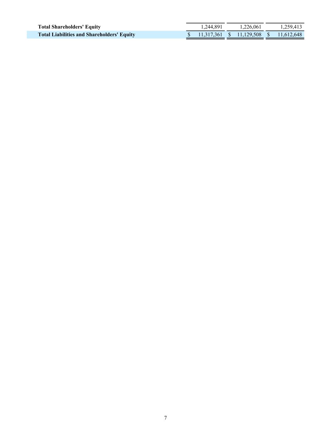 Total Shareholders' Equity 1,244,891 1,226,061 1,259,413 Total Liabilities and Shareholders' Equity $ 11,317,361 $ 11,129,508 $ 11,612,648 7
