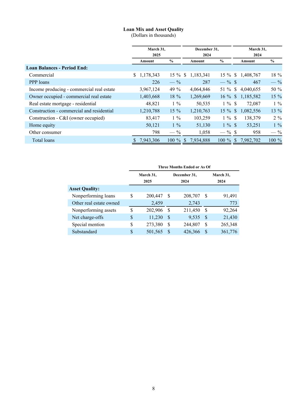 Loan Mix and Asset Quality (Dollars in thousands) March 31, December 31, March 31, 2025 2024 2024 Amount % Amount % Amount % Loan Balances - Period End: Commercial $ 1,178,343 15 % $ 1,183,341 15 % $ 1,408,767 18 % PPP loans 226 — % 287 — % $ 467 — % Income producing - commercial real estate 3,967,124 49 % 4,064,846 51 % $ 4,040,655 50 % Owner occupied - commercial real estate 1,403,668 18 % 1,269,669 16 % $ 1,185,582 15 % Real estate mortgage - residential 48,821 1 % 50,535 1 % $ 72,087 1 % Construction - commercial and residential 1,210,788 15 % 1,210,763 15 % $ 1,082,556 13 % Construction - C&I (owner occupied) 83,417 1 % 103,259 1 % $ 138,379 2 % Home equity 50,121 1 % 51,130 1 % $ 53,251 1 % Other consumer 798 — % 1,058 — % $ 958 — % Total loans $ 7,943,306 100 % $ 7,934,888 100 % $ 7,982,702 100 % Three Months Ended or As Of March 31, December 31, March 31, 2025 2024 2024 Asset Quality: Nonperforming loans $ 200,447 $ 208,707 $ 91,491 Other real estate owned 2,459 2,743 773 Nonperforming assets $ 202,906 $ 211,450 $ 92,264 Net charge-offs $ 11,230 $ 9,535 $ 21,430 Special mention $ 273,380 $ 244,807 $ 265,348 Substandard $ 501,565 $ 426,366 $ 361,776 8