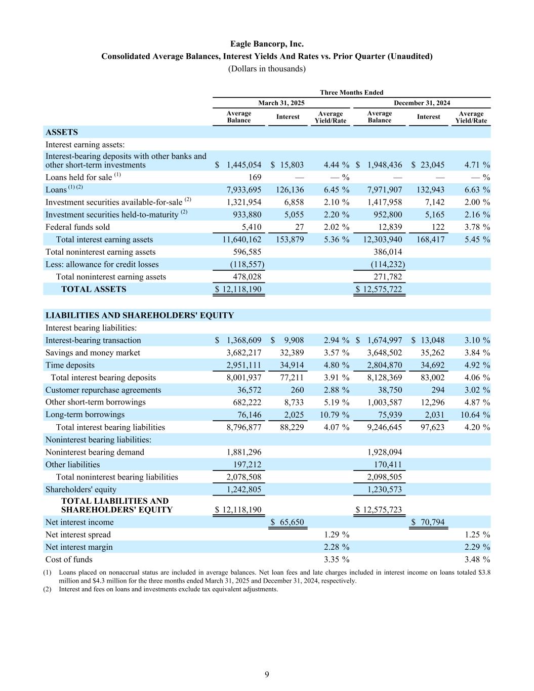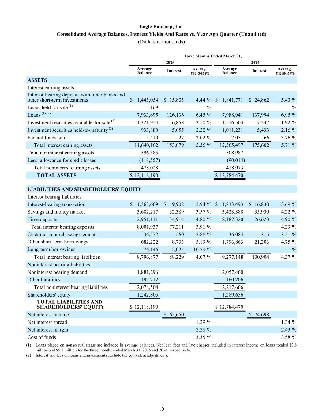 Eagle Bancorp, Inc. Consolidated Average Balances, Interest Yields And Rates vs. Prior Quarter (Unaudited) (Dollars in thousands) Three Months Ended March 31, 2025 December 31, 2024 Average Balance Interest Average Yield/Rate Average Balance Interest Average Yield/Rate ASSETS Interest earning assets: Interest-bearing deposits with other banks and other short-term investments $ 1,445,054 $ 15,803 4.44 % $ 1,948,436 $ 23,045 4.71 % Loans held for sale (1) 169 — — % — — — % Loans (1) (2) 7,933,695 126,136 6.45 % 7,971,907 132,943 6.63 % Investment securities available-for-sale (2) 1,321,954 6,858 2.10 % 1,417,958 7,142 2.00 % Investment securities held-to-maturity (2) 933,880 5,055 2.20 % 952,800 5,165 2.16 % Federal funds sold 5,410 27 2.02 % 12,839 122 3.78 % Total interest earning assets 11,640,162 153,879 5.36 % 12,303,940 168,417 5.45 % Total noninterest earning assets 596,585 386,014 Less: allowance for credit losses (118,557) (114,232) Total noninterest earning assets 478,028 271,782 TOTAL ASSETS $ 12,118,190 $ 12,575,722 LIABILITIES AND SHAREHOLDERS' EQUITY Interest bearing liabilities: Interest-bearing transaction $ 1,368,609 $ 9,908 2.94 % $ 1,674,997 $ 13,048 3.10 % Savings and money market 3,682,217 32,389 3.57 % 3,648,502 35,262 3.84 % Time deposits 2,951,111 34,914 4.80 % 2,804,870 34,692 4.92 % Total interest bearing deposits 8,001,937 77,211 3.91 % 8,128,369 83,002 4.06 % Customer repurchase agreements 36,572 260 2.88 % 38,750 294 3.02 % Other short-term borrowings 682,222 8,733 5.19 % 1,003,587 12,296 4.87 % Long-term borrowings 76,146 2,025 10.79 % 75,939 2,031 10.64 % Total interest bearing liabilities 8,796,877 88,229 4.07 % 9,246,645 97,623 4.20 % Noninterest bearing liabilities: Noninterest bearing demand 1,881,296 1,928,094 Other liabilities 197,212 170,411 Total noninterest bearing liabilities 2,078,508 2,098,505 Shareholders' equity 1,242,805 1,230,573 TOTAL LIABILITIES AND SHAREHOLDERS' EQUITY $ 12,118,190 $ 12,575,723 Net interest income $ 65,650 $ 70,794 Net interest spread 1.29 % 1.25 % Net interest margin 2.28 % 2.29 % Cost of funds 3.35 % 3.48 % (1) Loans placed on nonaccrual status are included in average balances. Net loan fees and late charges included in interest income on loans totaled $3.8 million and $4.3 million for the three months ended March 31, 2025 and December 31, 2024, respectively. (2) Interest and fees on loans and investments exclude tax equivalent adjustments. 9