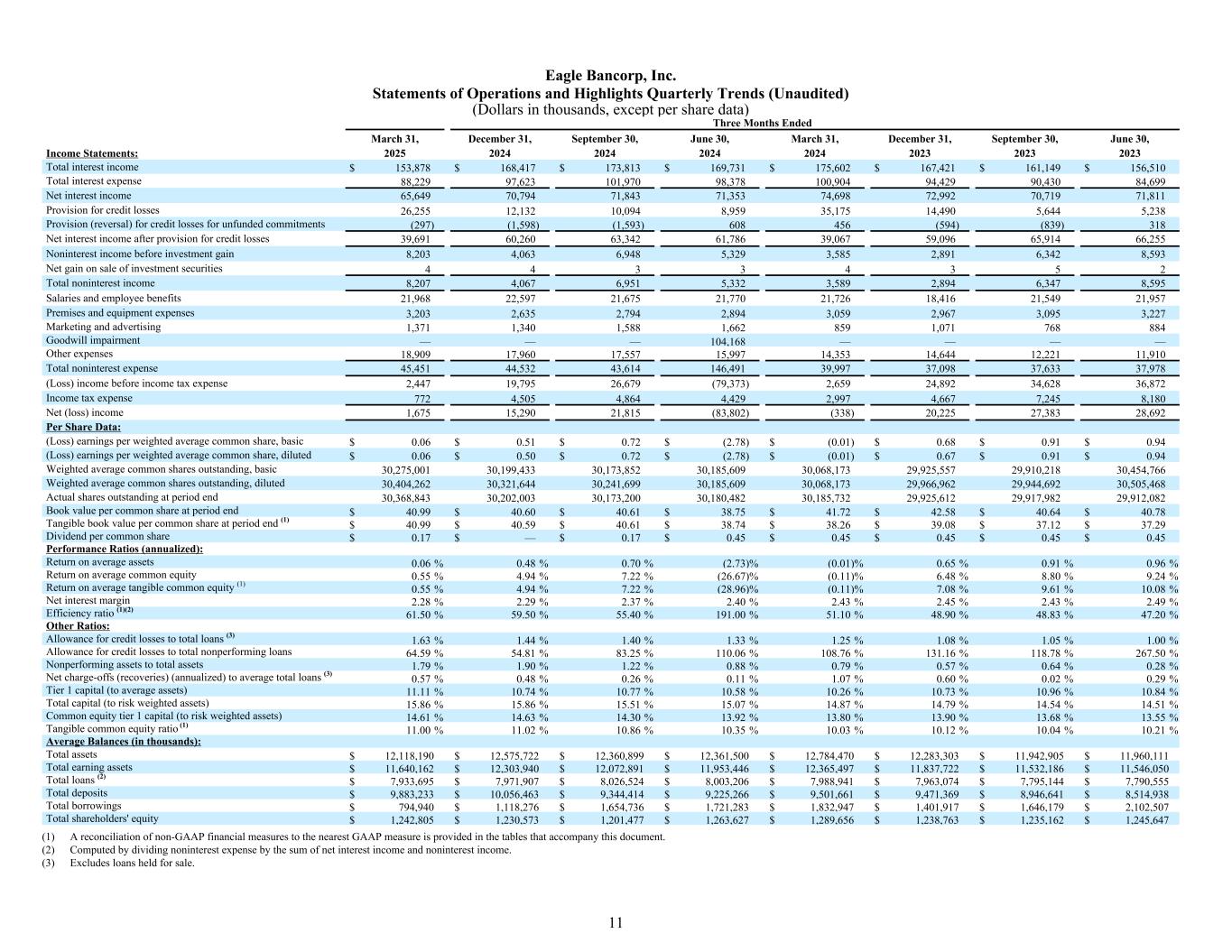 Eagle Bancorp, Inc. Statements of Operations and Highlights Quarterly Trends (Unaudited) (Dollars in thousands, except per share data) Three Months Ended March 31, December 31, September 30, June 30, March 31, December 31, September 30, June 30, Income Statements: 2025 2024 2024 2024 2024 2023 2023 2023 Total interest income $ 153,878 $ 168,417 $ 173,813 $ 169,731 $ 175,602 $ 167,421 $ 161,149 $ 156,510 Total interest expense 88,229 97,623 101,970 98,378 100,904 94,429 90,430 84,699 Net interest income 65,649 70,794 71,843 71,353 74,698 72,992 70,719 71,811 Provision for credit losses 26,255 12,132 10,094 8,959 35,175 14,490 5,644 5,238 Provision (reversal) for credit losses for unfunded commitments (297) (1,598) (1,593) 608 456 (594) (839) 318 Net interest income after provision for credit losses 39,691 60,260 63,342 61,786 39,067 59,096 65,914 66,255 Noninterest income before investment gain 8,203 4,063 6,948 5,329 3,585 2,891 6,342 8,593 Net gain on sale of investment securities 4 4 3 3 4 3 5 2 Total noninterest income 8,207 4,067 6,951 5,332 3,589 2,894 6,347 8,595 Salaries and employee benefits 21,968 22,597 21,675 21,770 21,726 18,416 21,549 21,957 Premises and equipment expenses 3,203 2,635 2,794 2,894 3,059 2,967 3,095 3,227 Marketing and advertising 1,371 1,340 1,588 1,662 859 1,071 768 884 Goodwill impairment — — — 104,168 — — — — Other expenses 18,909 17,960 17,557 15,997 14,353 14,644 12,221 11,910 Total noninterest expense 45,451 44,532 43,614 146,491 39,997 37,098 37,633 37,978 (Loss) income before income tax expense 2,447 19,795 26,679 (79,373) 2,659 24,892 34,628 36,872 Income tax expense 772 4,505 4,864 4,429 2,997 4,667 7,245 8,180 Net (loss) income 1,675 15,290 21,815 (83,802) (338) 20,225 27,383 28,692 Per Share Data: (Loss) earnings per weighted average common share, basic $ 0.06 $ 0.51 $ 0.72 $ (2.78) $ (0.01) $ 0.68 $ 0.91 $ 0.94 (Loss) earnings per weighted average common share, diluted $ 0.06 $ 0.50 $ 0.72 $ (2.78) $ (0.01) $ 0.67 $ 0.91 $ 0.94 Weighted average common shares outstanding, basic 30,275,001 30,199,433 30,173,852 30,185,609 30,068,173 29,925,557 29,910,218 30,454,766 Weighted average common shares outstanding, diluted 30,404,262 30,321,644 30,241,699 30,185,609 30,068,173 29,966,962 29,944,692 30,505,468 Actual shares outstanding at period end 30,368,843 30,202,003 30,173,200 30,180,482 30,185,732 29,925,612 29,917,982 29,912,082 Book value per common share at period end $ 40.99 $ 40.60 $ 40.61 $ 38.75 $ 41.72 $ 42.58 $ 40.64 $ 40.78 Tangible book value per common share at period end (1) $ 40.99 $ 40.59 $ 40.61 $ 38.74 $ 38.26 $ 39.08 $ 37.12 $ 37.29 Dividend per common share $ 0.17 $ — $ 0.17 $ 0.45 $ 0.45 $ 0.45 $ 0.45 $ 0.45 Performance Ratios (annualized): Return on average assets 0.06 % 0.48 % 0.70 % (2.73) % (0.01) % 0.65 % 0.91 % 0.96 % Return on average common equity 0.55 % 4.94 % 7.22 % (26.67) % (0.11) % 6.48 % 8.80 % 9.24 % Return on average tangible common equity (1) 0.55 % 4.94 % 7.22 % (28.96) % (0.11) % 7.08 % 9.61 % 10.08 % Net interest margin 2.28 % 2.29 % 2.37 % 2.40 % 2.43 % 2.45 % 2.43 % 2.49 % Efficiency ratio (1)(2) 61.50 % 59.50 % 55.40 % 191.00 % 51.10 % 48.90 % 48.83 % 47.20 % Other Ratios: Allowance for credit losses to total loans (3) 1.63 % 1.44 % 1.40 % 1.33 % 1.25 % 1.08 % 1.05 % 1.00 % Allowance for credit losses to total nonperforming loans 64.59 % 54.81 % 83.25 % 110.06 % 108.76 % 131.16 % 118.78 % 267.50 % Nonperforming assets to total assets 1.79 % 1.90 % 1.22 % 0.88 % 0.79 % 0.57 % 0.64 % 0.28 % Net charge-offs (recoveries) (annualized) to average total loans (3) 0.57 % 0.48 % 0.26 % 0.11 % 1.07 % 0.60 % 0.02 % 0.29 % Tier 1 capital (to average assets) 11.11 % 10.74 % 10.77 % 10.58 % 10.26 % 10.73 % 10.96 % 10.84 % Total capital (to risk weighted assets) 15.86 % 15.86 % 15.51 % 15.07 % 14.87 % 14.79 % 14.54 % 14.51 % Common equity tier 1 capital (to risk weighted assets) 14.61 % 14.63 % 14.30 % 13.92 % 13.80 % 13.90 % 13.68 % 13.55 % Tangible common equity ratio (1) 11.00 % 11.02 % 10.86 % 10.35 % 10.03 % 10.12 % 10.04 % 10.21 % Average Balances (in thousands): Total assets $ 12,118,190 $ 12,575,722 $ 12,360,899 $ 12,361,500 $ 12,784,470 $ 12,283,303 $ 11,942,905 $ 11,960,111 Total earning assets $ 11,640,162 $ 12,303,940 $ 12,072,891 $ 11,953,446 $ 12,365,497 $ 11,837,722 $ 11,532,186 $ 11,546,050 Total loans (2) $ 7,933,695 $ 7,971,907 $ 8,026,524 $ 8,003,206 $ 7,988,941 $ 7,963,074 $ 7,795,144 $ 7,790,555 Total deposits $ 9,883,233 $ 10,056,463 $ 9,344,414 $ 9,225,266 $ 9,501,661 $ 9,471,369 $ 8,946,641 $ 8,514,938 Total borrowings $ 794,940 $ 1,118,276 $ 1,654,736 $ 1,721,283 $ 1,832,947 $ 1,401,917 $ 1,646,179 $ 2,102,507 Total shareholders' equity $ 1,242,805 $ 1,230,573 $ 1,201,477 $ 1,263,627 $ 1,289,656 $ 1,238,763 $ 1,235,162 $ 1,245,647 (1) A reconciliation of non-GAAP financial measures to the nearest GAAP measure is provided in the tables that accompany this document. (2) Computed by dividing noninterest expense by the sum of net interest income and noninterest income. (3) Excludes loans held for sale. 11
