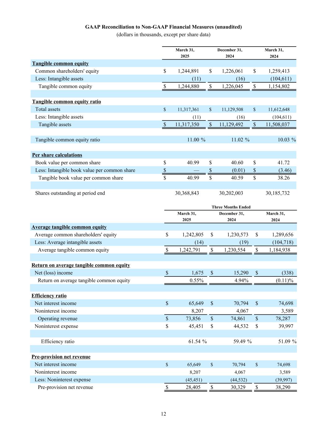 GAAP Reconciliation to Non-GAAP Financial Measures (unaudited) (dollars in thousands, except per share data) March 31, December 31, March 31, 2025 2024 2024 Tangible common equity Common shareholders' equity $ 1,244,891 $ 1,226,061 $ 1,259,413 Less: Intangible assets (11) (16) (104,611) Tangible common equity $ 1,244,880 $ 1,226,045 $ 1,154,802 Tangible common equity ratio Total assets $ 11,317,361 $ 11,129,508 $ 11,612,648 Less: Intangible assets (11) (16) (104,611) Tangible assets $ 11,317,350 $ 11,129,492 $ 11,508,037 Tangible common equity ratio 11.00 % 11.02 % 10.03 % Per share calculations Book value per common share $ 40.99 $ 40.60 $ 41.72 Less: Intangible book value per common share $ — $ (0.01) $ (3.46) Tangible book value per common share $ 40.99 $ 40.59 $ 38.26 Shares outstanding at period end 30,368,843 30,202,003 30,185,732 Three Months Ended March 31, December 31, March 31, 2025 2024 2024 Average tangible common equity Average common shareholders' equity $ 1,242,805 $ 1,230,573 $ 1,289,656 Less: Average intangible assets (14) (19) (104,718) Average tangible common equity $ 1,242,791 $ 1,230,554 $ 1,184,938 Return on average tangible common equity Net (loss) income $ 1,675 $ 15,290 $ (338) Return on average tangible common equity 0.55 % 4.94 % (0.11) % Efficiency ratio Net interest income $ 65,649 $ 70,794 $ 74,698 Noninterest income 8,207 4,067 3,589 Operating revenue $ 73,856 $ 74,861 $ 78,287 Noninterest expense $ 45,451 $ 44,532 $ 39,997 Efficiency ratio 61.54 % 59.49 % 51.09 % Pre-provision net revenue Net interest income $ 65,649 $ 70,794 $ 74,698 Noninterest income 8,207 4,067 3,589 Less: Noninterest expense (45,451) (44,532) (39,997) Pre-provision net revenue $ 28,405 $ 30,329 $ 38,290 12