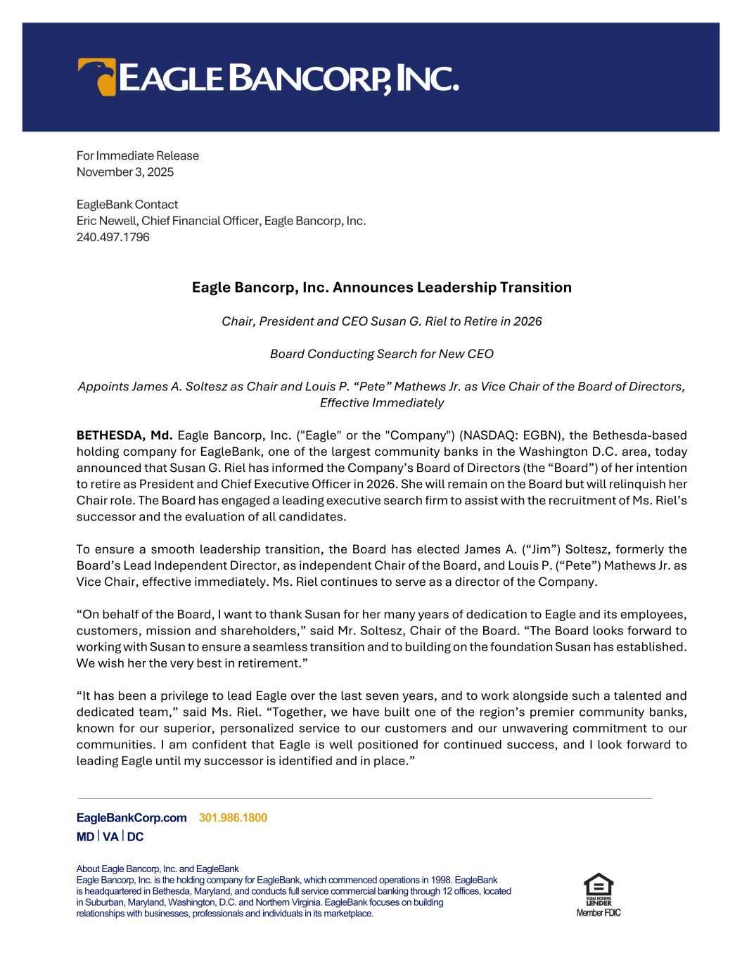 EagleBankCorp.com 301.986.1800 MD | VA | DC About Eagle Bancorp, Inc. and EagleBank Eagle Bancorp, Inc. is the holding company for EagleBank, which commenced operations in 1998. EagleBank is headquartered in Bethesda, Maryland, and conducts full service commercial banking through 12 offices, located in Suburban, Maryland, Washington, D.C. and Northern Virginia. EagleBank focuses on building relationships with businesses, professionals and individuals in its marketplace. For Immediate Release November 3, 2025 EagleBank Contact Eric Newell, Chief Financial Officer, Eagle Bancorp, Inc. 240.497.1796 Eagle Bancorp, Inc. Announces Leadership Transition Chair, President and CEO Susan G. Riel to Retire in 2026 Board Conducting Search for New CEO Appoints James A. Soltesz as Chair and Louis P. “Pete” Mathews Jr. as Vice Chair of the Board of Directors, Effective Immediately BETHESDA, Md. Eagle Bancorp, Inc. ("Eagle" or the "Company") (NASDAQ: EGBN), the Bethesda-based holding company for EagleBank, one of the largest community banks in the Washington D.C. area, today announced that Susan G. Riel has informed the Company’s Board of Directors (the “Board”) of her intention to retire as President and Chief Executive Officer in 2026. She will remain on the Board but will relinquish her Chair role. The Board has engaged a leading executive search firm to assist with the recruitment of Ms. Riel’s successor and the evaluation of all candidates. To ensure a smooth leadership transition, the Board has elected James A. (“Jim”) Soltesz, formerly the Board’s Lead Independent Director, as independent Chair of the Board, and Louis P. (“Pete”) Mathews Jr. as Vice Chair, effective immediately. Ms. Riel continues to serve as a director of the Company. “On behalf of the Board, I want to thank Susan for her many years of dedication to Eagle and its employees, customers, mission and shareholders,” said Mr. Soltesz, Chair of the Board. “The Board looks forward to working with Susan to ensure a seamless transition and to building on the foundation Susan has established. We wish her the very best in retirement.” “It has been a privilege to lead Eagle over the last seven years, and to work alongside such a talented and dedicated team,” said Ms. Riel. “Together, we have built one of the region’s premier community banks, known for our superior, personalized service to our customers and our unwavering commitment to our communities. I am confident that Eagle is well positioned for continued success, and I look forward to leading Eagle until my successor is identified and in place.”