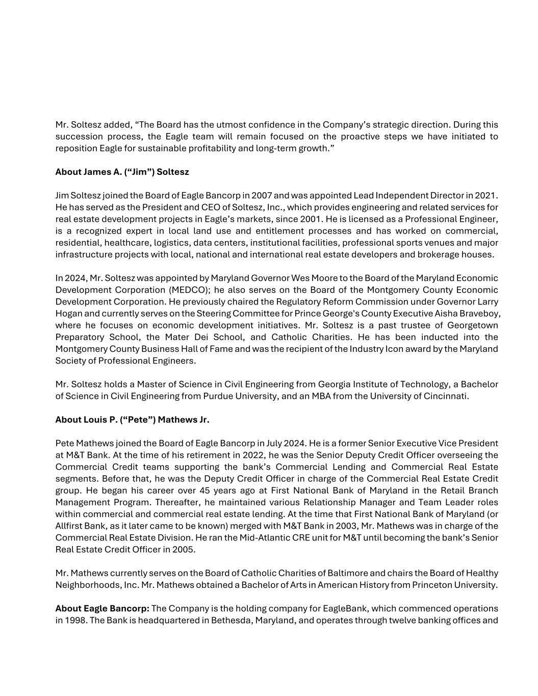 Mr. Soltesz added, “The Board has the utmost confidence in the Company’s strategic direction. During this succession process, the Eagle team will remain focused on the proactive steps we have initiated to reposition Eagle for sustainable profitability and long-term growth.” About James A. (“Jim”) Soltesz Jim Soltesz joined the Board of Eagle Bancorp in 2007 and was appointed Lead Independent Director in 2021. He has served as the President and CEO of Soltesz, Inc., which provides engineering and related services for real estate development projects in Eagle’s markets, since 2001. He is licensed as a Professional Engineer, is a recognized expert in local land use and entitlement processes and has worked on commercial, residential, healthcare, logistics, data centers, institutional facilities, professional sports venues and major infrastructure projects with local, national and international real estate developers and brokerage houses. In 2024, Mr. Soltesz was appointed by Maryland Governor Wes Moore to the Board of the Maryland Economic Development Corporation (MEDCO); he also serves on the Board of the Montgomery County Economic Development Corporation. He previously chaired the Regulatory Reform Commission under Governor Larry Hogan and currently serves on the Steering Committee for Prince George's County Executive Aisha Braveboy, where he focuses on economic development initiatives. Mr. Soltesz is a past trustee of Georgetown Preparatory School, the Mater Dei School, and Catholic Charities. He has been inducted into the Montgomery County Business Hall of Fame and was the recipient of the Industry Icon award by the Maryland Society of Professional Engineers. Mr. Soltesz holds a Master of Science in Civil Engineering from Georgia Institute of Technology, a Bachelor of Science in Civil Engineering from Purdue University, and an MBA from the University of Cincinnati. About Louis P. (“Pete”) Mathews Jr. Pete Mathews joined the Board of Eagle Bancorp in July 2024. He is a former Senior Executive Vice President at M&T Bank. At the time of his retirement in 2022, he was the Senior Deputy Credit Officer overseeing the Commercial Credit teams supporting the bank’s Commercial Lending and Commercial Real Estate segments. Before that, he was the Deputy Credit Officer in charge of the Commercial Real Estate Credit group. He began his career over 45 years ago at First National Bank of Maryland in the Retail Branch Management Program. Thereafter, he maintained various Relationship Manager and Team Leader roles within commercial and commercial real estate lending. At the time that First National Bank of Maryland (or Allfirst Bank, as it later came to be known) merged with M&T Bank in 2003, Mr. Mathews was in charge of the Commercial Real Estate Division. He ran the Mid-Atlantic CRE unit for M&T until becoming the bank’s Senior Real Estate Credit Officer in 2005. Mr. Mathews currently serves on the Board of Catholic Charities of Baltimore and chairs the Board of Healthy Neighborhoods, Inc. Mr. Mathews obtained a Bachelor of Arts in American History from Princeton University. About Eagle Bancorp: The Company is the holding company for EagleBank, which commenced operations in 1998. The Bank is headquartered in Bethesda, Maryland, and operates through twelve banking offices and