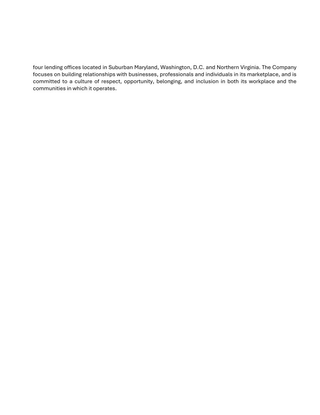 four lending offices located in Suburban Maryland, Washington, D.C. and Northern Virginia. The Company focuses on building relationships with businesses, professionals and individuals in its marketplace, and is committed to a culture of respect, opportunity, belonging, and inclusion in both its workplace and the communities in which it operates.