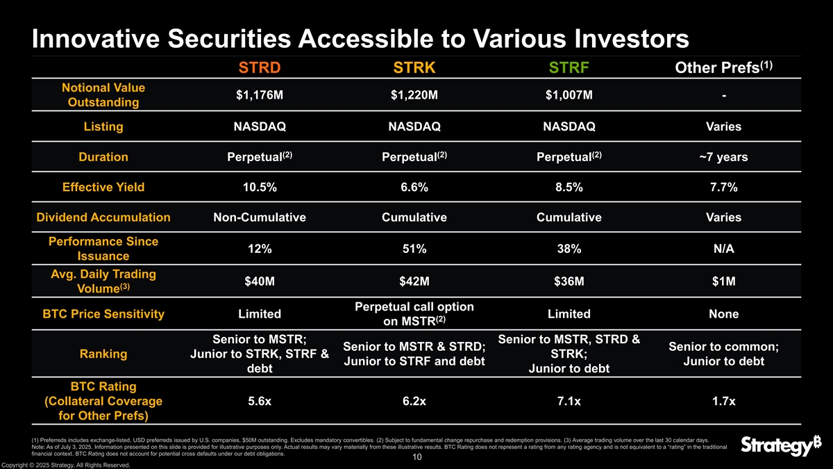 Lower Effective Yields Increase the BTC Torque via ATMs 12% 11% STRD 10.5% 10% 9% STRF 8.5% 8% 7% STRK 6.6% 6% 1/31/25 2/28/25 3/31/25 4/30/25 5/31/25 6/30/25 Past performance is not indicative of future results. 9 Copyright © 2025 Strategy. All Rights Reserved.