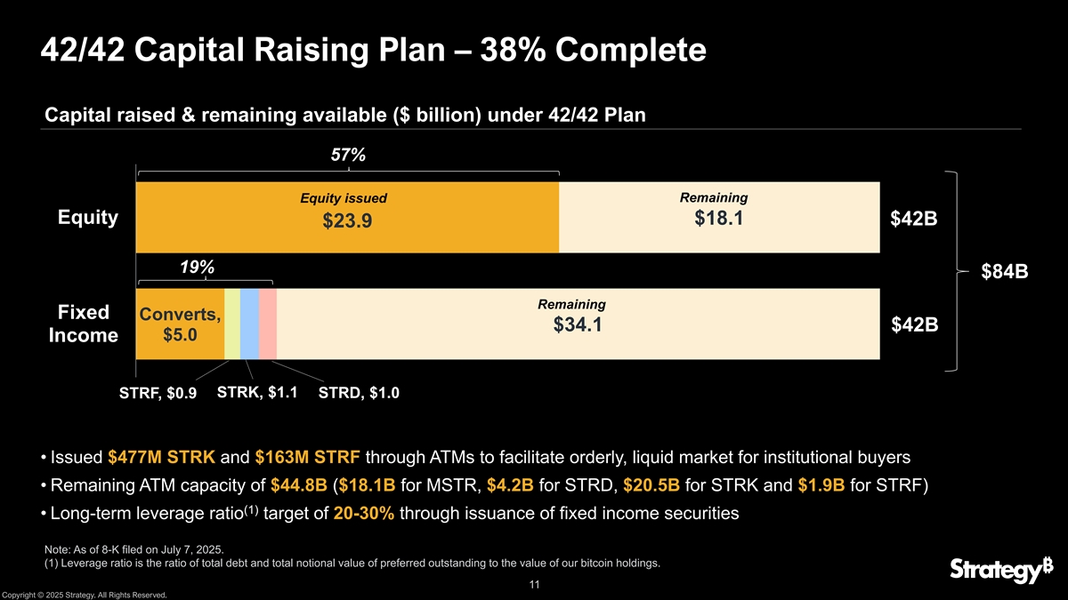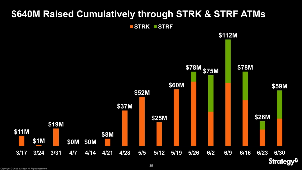 I’ll do a quick recap on our total capital raising plan. We issued additional equity in the second quarter, but a little bit less than we have at a slower pace as we move towards issuing more ATMs on our preferreds. So you’ll see that we’re at $23.9 billion on our $42 billion capacity on MSTR ATMs. It’s about 57% total. As I mentioned, we’ve increased the pace of issuance of ATMs on top of our preferreds STRK and STRF, and soon to be STRD, and we’re at 19% on $42 billion there.