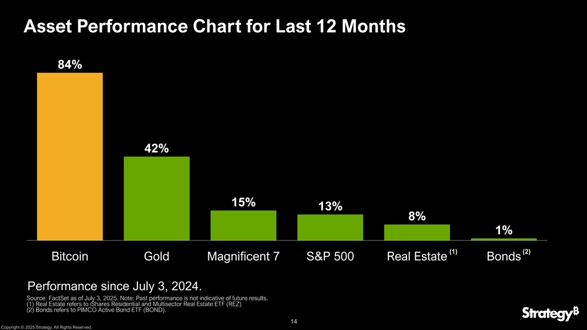 Annualized Asset Performance Chart since Aug 10, 2020 57% 26% 14% 11% 6% -4% (1) (2) Bitcoin Magnificent 7 S&P 500 Gold Real Estate Bonds Performance since August 10, 2020, when Strategy adopted its bitcoin strategy. Source: FactSet as of July 3, 2025. Note: Past performance is not indicative of future results. (1) Real Estate refers to iShares Residential and Multisector Real Estate ETF (REZ) (2) Bonds refers to PIMCO Active Bond ETF (BOND). 13 Copyright © 2025 Strategy. All Rights Reserved.