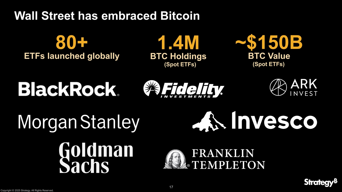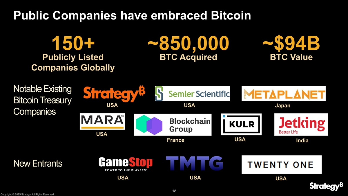 Wall Street has embraced Bitcoin 80+ ~$150B 1.4M ETFs launched globally BTC Value BTC Holdings (Spot ETFs) (Spot ETFs) 17 Copyright © 2025 Strategy. All Rights Reserved.