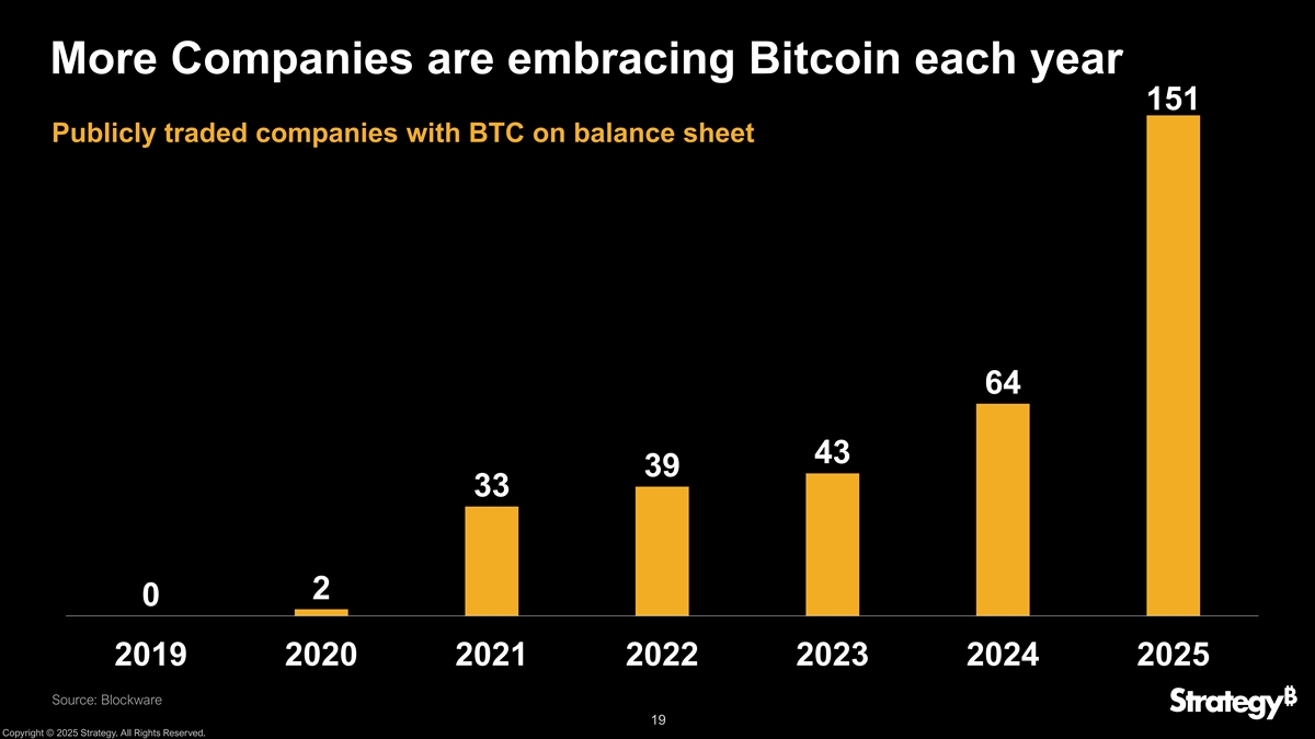 Public companies are embracing Bitcoin. We’ve got 150 publicly listed companies that are acquiring bitcoin now. This is extraordinary, and it’s a trend that’s building in momentum. In, 2024, there were 64 public companies that had embraced Bitcoin, and this year, there’s 151. And of course, back in 2020, we were the first and there were just two. So public companies, embracing Bitcoin is a big, trend for the past twelve months and a big driver, and they are even racing to get into the ‘Bitcoin 100’, and you can see here all the green arrows are public companies that bought Bitcoin just in the past week.