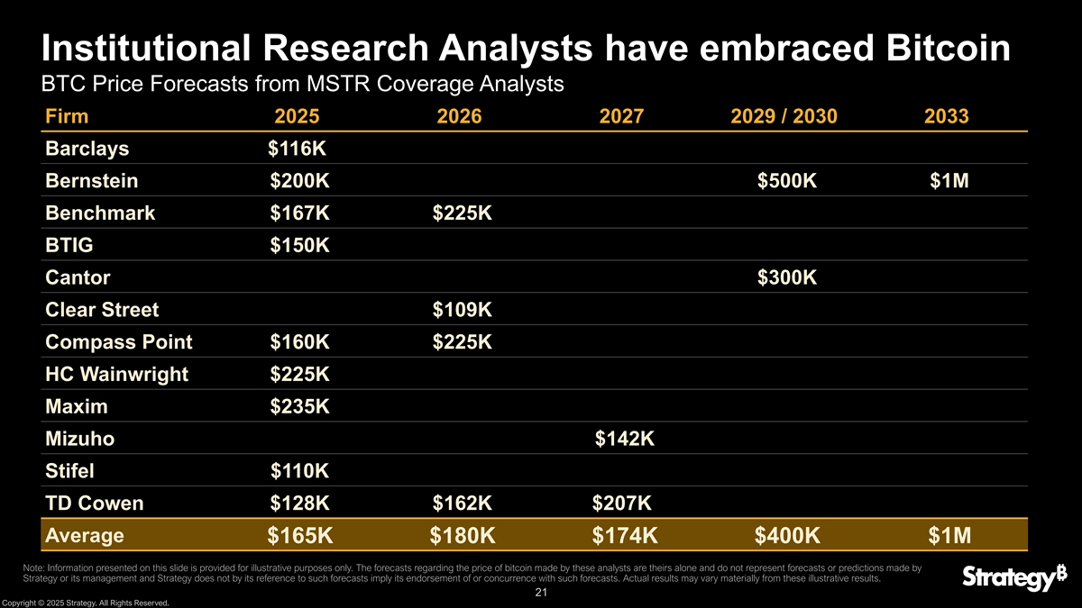 Institutional Research Analysts have embraced Bitcoin BTC Price Forecasts from MSTR Coverage Analysts Firm 2025 2026 2027 2029 / 2030 2033 Barclays $116K Bernstein $200K $500K $1M Benchmark $167K $225K BTIG $150K Cantor $300K Clear Street $109K Compass Point $160K $225K HC Wainwright $225K Maxim $235K Mizuho $142K Stifel $110K TD Cowen $128K $162K $207K Average $165K $180K $174K $400K $1M Note: Information presented on this slide is provided for illustrative purposes only. The forecasts regarding the price of bitcoin made by these analysts are theirs alone and do not represent forecasts or predictions made by Strategy or its management and Strategy does not by its reference to such forecasts imply its endorsement of or concurrence with such forecasts. Actual results may vary materially from these illustrative results. 21 Copyright © 2025 Strategy. All Rights Reserved.