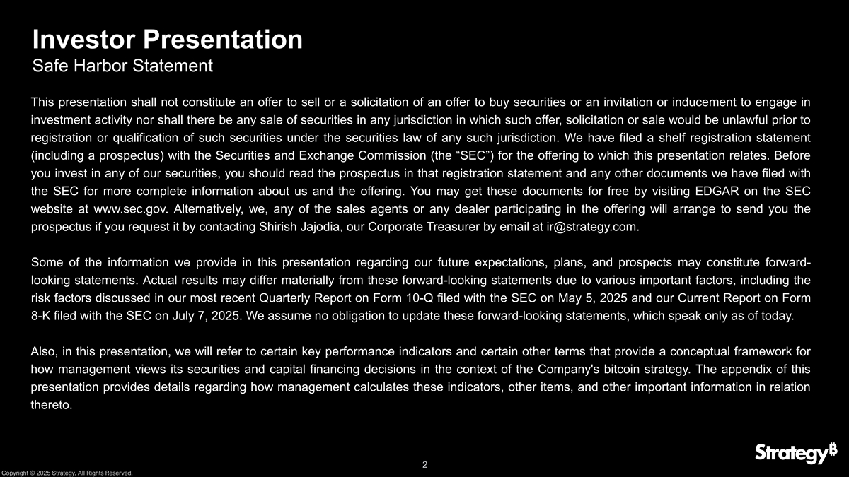 Investor Presentation Safe Harbor Statement This presentation shall not constitute an offer to sell or a solicitation of an offer to buy securities or an invitation or inducement to engage in investment activity nor shall there be any sale of securities in any jurisdiction in which such offer, solicitation or sale would be unlawful prior to registration or qualification of such securities under the securities law of any such jurisdiction. We have filed a shelf registration statement (including a prospectus) with the Securities and Exchange Commission (the “SEC”) for the offering to which this presentation relates. Before you invest in any of our securities, you should read the prospectus in that registration statement and any other documents we have filed with the SEC for more complete information about us and the offering. You may get these documents for free by visiting EDGAR on the SEC website at www.sec.gov. Alternatively, we, any of the sales agents or any dealer participating in the offering will arrange to send you the prospectus if you request it by contacting Shirish Jajodia, our Corporate Treasurer by email at ir@strategy.com. Some of the information we provide in this presentation regarding our future expectations, plans, and prospects may constitute forward- looking statements. Actual results may differ materially from these forward-looking statements due to various important factors, including the risk factors discussed in our most recent Quarterly Report on Form 10-Q filed with the SEC on May 5, 2025 and our Current Report on Form 8-K filed with the SEC on July 7, 2025. We assume no obligation to update these forward-looking statements, which speak only as of today. Also, in this presentation, we will refer to certain key performance indicators and certain other terms that provide a conceptual framework for how management views its securities and capital financing decisions in the context of the Company's bitcoin strategy. The appendix of this presentation provides details regarding how management calculates these indicators, other items, and other important information in relation thereto. 2 Copyright © 2025 Strategy. All Rights Reserved.