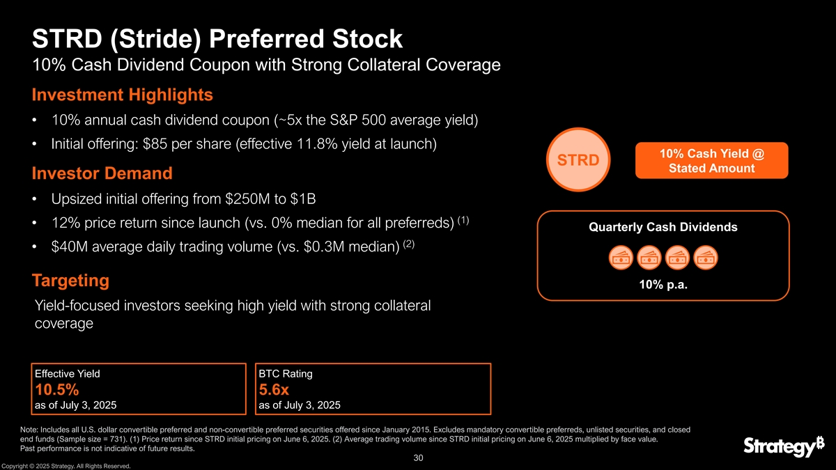STRD (Stride) Preferred Stock 10% Cash Dividend Coupon with Strong Collateral Coverage Investment Highlights • 10% annual cash dividend coupon (~5x the S&P 500 average yield) • Initial offering: $85 per share (effective 11.8% yield at launch) 10% Cash Yield @ STRD Stated Amount Investor Demand • Upsized initial offering from $250M to $1B (1) • 12% price return since launch (vs. 0% median for all preferreds) Quarterly Cash Dividends (2) • $40M average daily trading volume (vs. $0.3M median) Targeting 10% p.a. Yield-focused investors seeking high yield with strong collateral coverage Effective Yield BTC Rating 10.5% 5.6x as of July 3, 2025 as of July 3, 2025 Note: Includes all U.S. dollar convertible preferred and non-convertible preferred securities offered since January 2015. Excludes mandatory convertible preferreds, unlisted securities, and closed end funds (Sample size = 731). (1) Price return since STRD initial pricing on June 6, 2025. (2) Average trading volume since STRD initial pricing on June 6, 2025 multiplied by face value. Past performance is not indicative of future results. 30 Copyright © 2025 Strategy. All Rights Reserved.