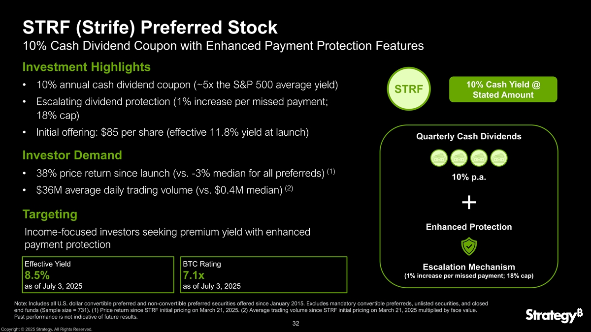 STRK (Strike) Preferred Stock 8% Dividend Coupon Plus MSTR Exposure Through Conversion Rights Investment Highlights Conversion STRK Quarterly • 8% annual dividend (~4x the S&P 500 average yield) Option Dividends (0.1x MSTR • Convertible to common stock (0.1 shares per preferred) (8% p.a.) per STRK) • Initial offering: $80 per share (effective 10% yield at launch) 8% Coupon @ Notional Value Investor Demand Bitcoin Upside with (1) • 51% price return since launch (vs. -3% median for all preferreds) Yield Protection (2) • $42M average daily trading volume (vs. $0.4M median) STRK MSTR Targeting Convert to Growth-oriented income investors seeking Bitcoin exposure with yield MSTR 1 MSTR 10 STRK protection share shares Conversion Value at Different MSTR Prices: Effective Yield BTC Rating MSTR @ $500 MSTR @ $1,000 MSTR @ $5,000 6.6% 6.2x 0.5x notional 1.0x notional 5.0x notional as of July 3, 2025 as of July 3, 2025 value value value Note: Includes all U.S. dollar convertible preferred and non-convertible preferred securities offered since January 2015. Excludes mandatory convertible preferreds, unlisted securities, and closed end funds (Sample size = 731). (1) Price return since STRK initial pricing on January 31, 2025. (2) Average trading volume since STRK initial pricing on January 31, 2025, multiplied by face value. Past performance is not indicative of future results. 31 Copyright © 2025 Strategy. All Rights Reserved.