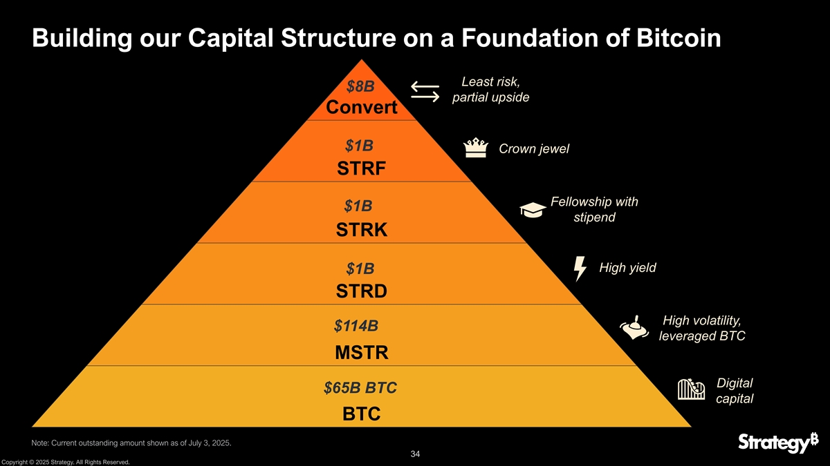 Seniority & Volatility of our Securities High STRF 10% fixed dividend, perpetual preferred $2.1 billion ATM STRK 8% fixed dividend, convertible preferred $21 billion ATM STRD 10% fixed non- cumulative dividend, perpetual preferred MSTR $4.2 billion ATM Leveraged Bitcoin Exposure $21 billion ATM Low Volatility High Note: Information presented on this slide is provided for illustrative purposes only. Volatility is based on historical volatility with respect to all securities. Past performance is not indicative of future results. 33 33 Copyright © 2025 Strategy. All Rights Reserved. Seniority