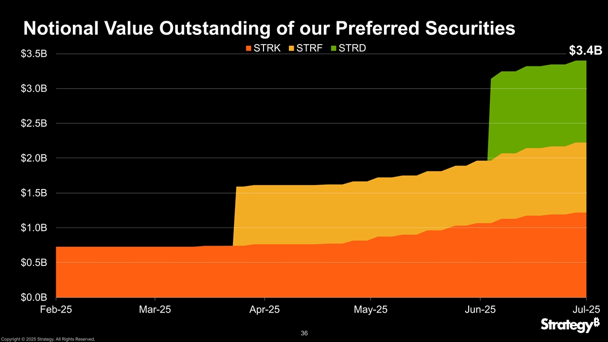 Notional Value Outstanding of our Preferred Securities STRK STRF STRD $3.4B $3.5B $3.0B $2.5B $2.0B $1.5B $1.0B $0.5B $0.0B Feb-25 Mar-25 Apr-25 May-25 Jun-25 Jul-25 36 Copyright © 2025 Strategy. All Rights Reserved.