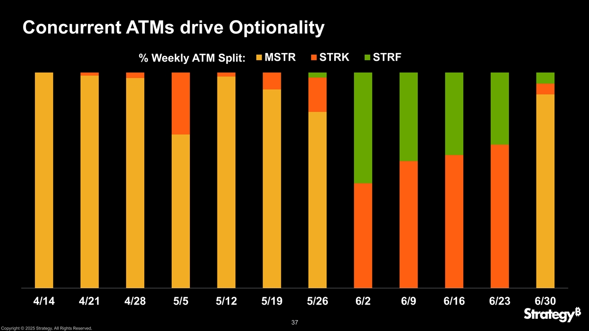 Concurrent ATMs drive Optionality MSTR STRK STRF % Weekly ATM Split: 4/14 4/21 4/28 5/5 5/12 5/19 5/26 6/2 6/9 6/16 6/23 6/30 37 Copyright © 2025 Strategy. All Rights Reserved.